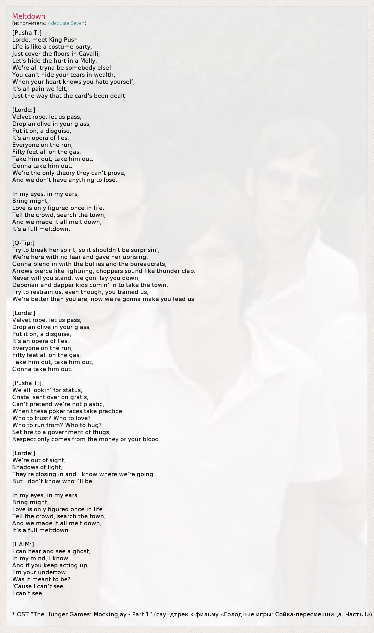 * OST "The Hunger Games: Mockingjay - Part 1" (саундтрек к фильму «Голодные игры: Сойка-пересмешница. Часть I»).