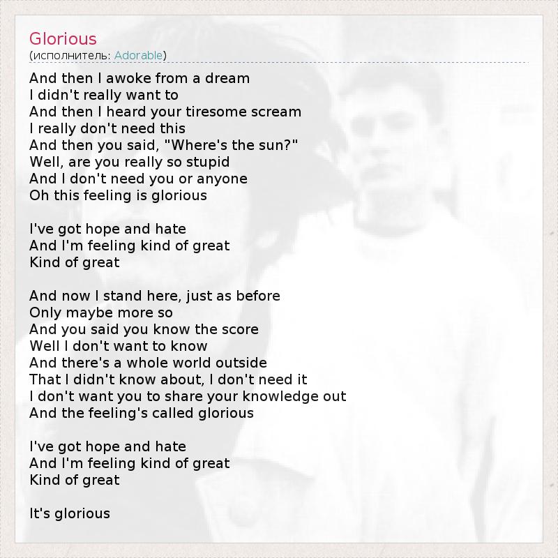 And then I awoke from a dream I didn't really want to And then I heard your tiresome scream I really don't need this And then you said, "Where's the sun?" Well, are you really so stupid And I don't need you or anyone Oh this feeling is glorious I've got hope and hate And I'm feeling kind of great Kind of great And now I stand here, just as before Only maybe more so And you said you know the score Well I don't want to know And there's a whole world outside That I didn't know about, I don't need it I don't want you to share your knowledge out And the feeling's called glorious I've got hope and hate And I'm feeling kind of great Kind of great It's glorious