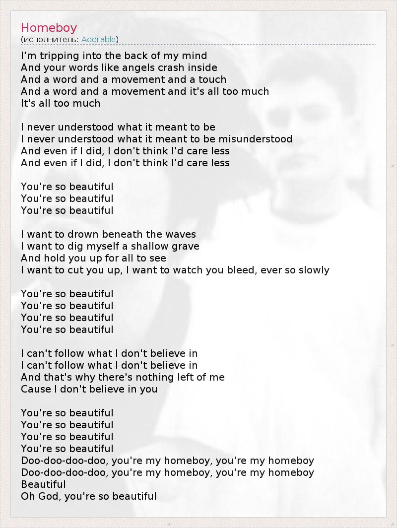 I'm tripping into the back of my mind And your words like angels crash inside And a word and a movement and a touch And a word and a movement and it's all too much It's all too much I never understood what it meant to be I never understood what it meant to be misunderstood And even if I did, I don't think I'd care less And even if I did, I don't think I'd care less You're so beautiful You're so beautiful You're so beautiful I want to drown beneath the waves I want to dig myself a shallow grave And hold you up for all to see I want to cut you up, I want to watch you bleed, ever so slowly You're so beautiful You're so beautiful You're so beautiful You're so beautiful I can't follow what I don't believe in I can't follow what I don't believe in And that's why there's nothing left of me Cause I don't believe in you You're so beautiful You're so beautiful You're so beautiful You're so beautiful Doo-doo-doo-doo, you're my homeboy, you're my homeboy Doo-doo-doo-doo, you're my homeboy, you're my homeboy Beautiful Oh God, you're so beautiful