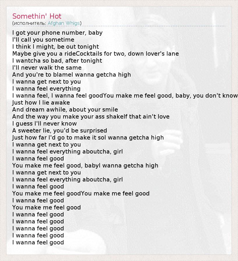 I got your phone number, baby I'll call you sometime I think I might, be out tonight Maybe give you a rideCocktails for two, down lover's lane I wantcha so bad, after tonight I'll never walk the same And you're to blameI wanna getcha high I wanna get next to you I wanna feel everything I wanna feel, I wanna feel goodYou make me feel good, baby, you don't know Just how I lie awake And dream awhile, about your smile And the way you make your ass shakeIf that ain't love I guess I'll never know A sweeter lie, you'd be surprised Just how far I'd go to make it soI wanna getcha high I wanna get next to you I wanna feel everything aboutcha, girl I wanna feel good You make me feel good, babyI wanna getcha high I wanna get next to you I wanna feel everything aboutcha, girl I wanna feel good You make me feel goodYou make me feel good I wanna feel good You make me feel good I wanna feel good I wanna feel good I wanna feel good I wanna feel good I wanna feel good