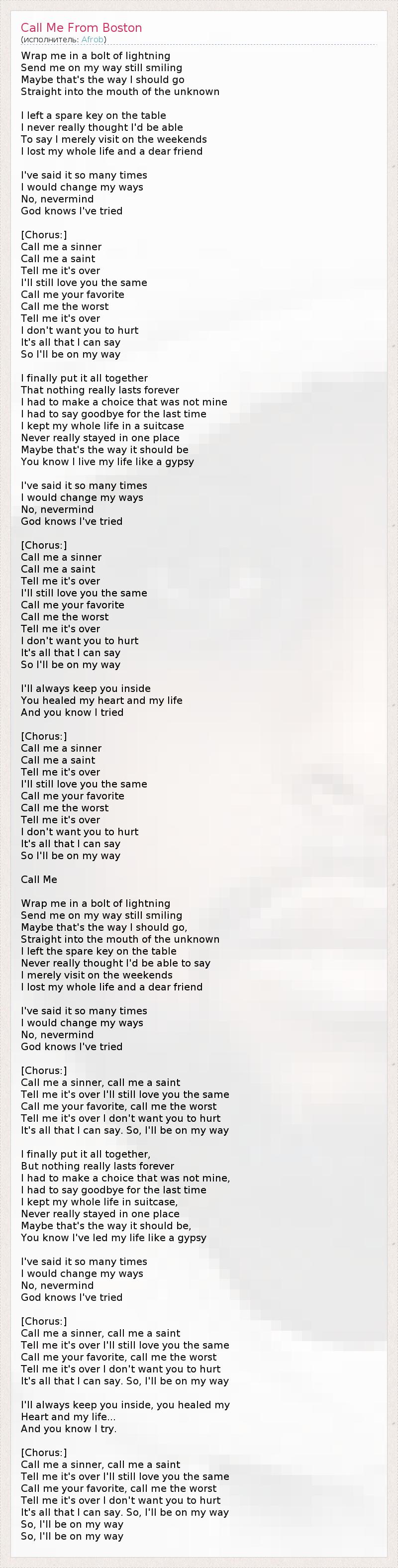 Wrap me in a bolt of lightning Send me on my way still smiling Maybe that's the way I should go Straight into the mouth of the unknown I left a spare key on the table I never really thought I'd be able To say I merely visit on the weekends I lost my whole life and a dear friend I've said it so many times I would change my ways No, nevermind God knows I've tried [Chorus:] Call me a sinner Call me a saint Tell me it's over I'll still love you the same Call me your favorite Call me the worst Tell me it's over I don't want you to hurt It's all that I can say So I'll be on my way I finally put it all together That nothing really lasts forever I had to make a choice that was not mine I had to say goodbye for the last time I kept my whole life in a suitcase Never really stayed in one place Maybe that's the way it should be You know I live my life like a gypsy I've said it so many times I would change my ways No, nevermind God knows I've tried [Chorus:] Call me a sinner Call me a saint Tell me it's over I'll still love you the same Call me your favorite Call me the worst Tell me it's over I don't want you to hurt It's all that I can say So I'll be on my way I'll always keep you inside You healed my heart and my life And you know I tried [Chorus:] Call me a sinner Call me a saint Tell me it's over I'll still love you the same Call me your favorite Call me the worst Tell me it's over I don't want you to hurt It's all that I can say So I'll be on my way Call Me Wrap me in a bolt of lightning Send me on my way still smiling Maybe that's the way I should go, Straight into the mouth of the unknown I left the spare key on the table Never really thought I'd be able to say I merely visit on the weekends I lost my whole life and a dear friend I've said it so many times I would change my ways No, nevermind God knows I've tried [Chorus:] Call me a sinner, call me a saint Tell me it's over I'll still love you the same Call me your favorite, call me the worst Tell me it's over I don't want you to hurt It's all that I can say. So, I'll be on my way I finally put it all together, But nothing really lasts forever I had to make a choice that was not mine, I had to say goodbye for the last time I kept my whole life in suitcase, Never really stayed in one place Maybe that's the way it should be, You know I've led my life like a gypsy I've said it so many times I would change my ways No, nevermind God knows I've tried [Chorus:] Call me a sinner, call me a saint Tell me it's over I'll still love you the same Call me your favorite, call me the worst Tell me it's over I don't want you to hurt It's all that I can say. So, I'll be on my way I'll always keep you inside, you healed my Heart and my life... And you know I try. [Chorus:] Call me a sinner, call me a saint Tell me it's over I'll still love you the same Call me your favorite, call me the worst Tell me it's over I don't want you to hurt It's all that I can say. So, I'll be on my way So, I'll be on my way So, I'll be on my way