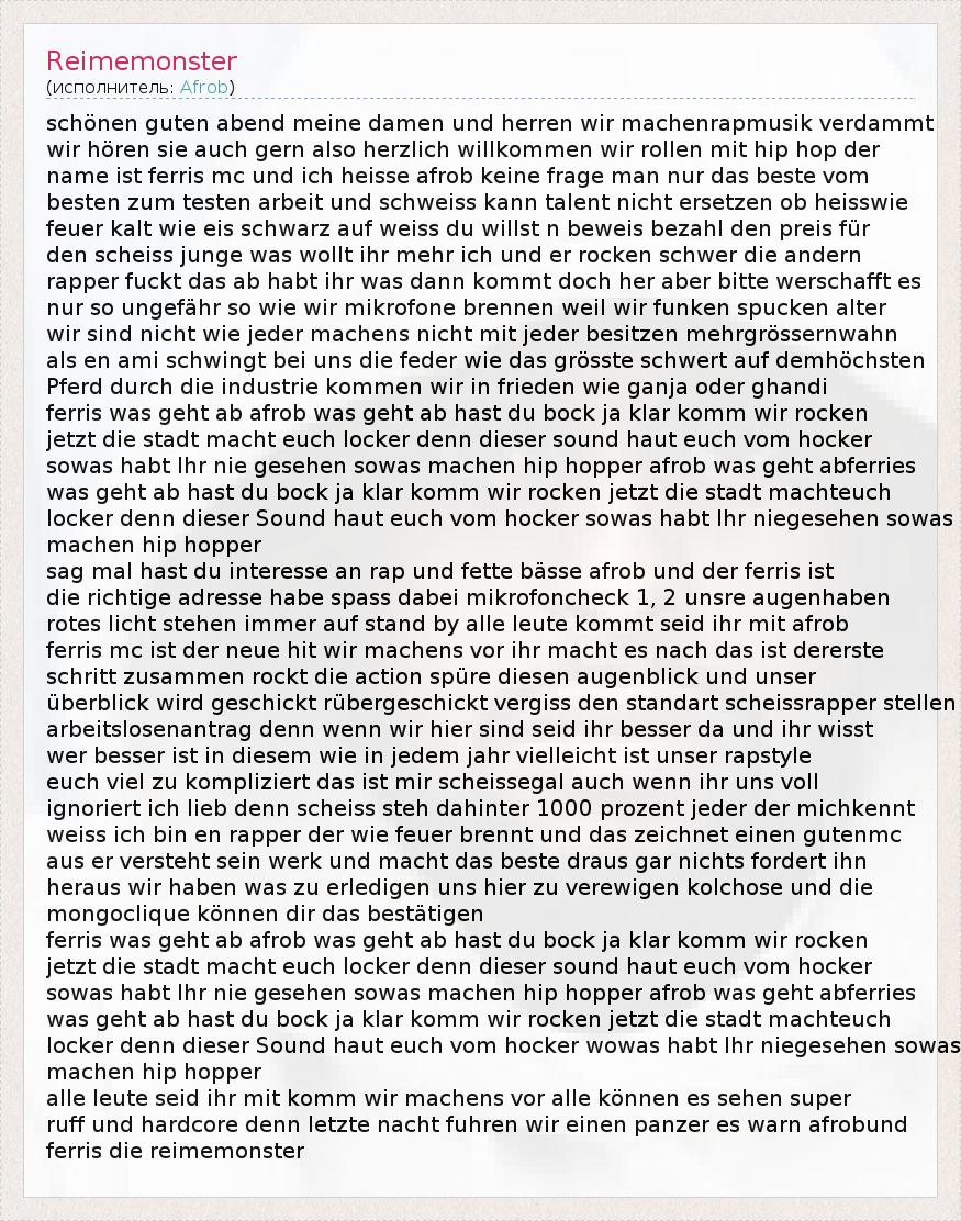 schönen guten abend meine damen und herren wir machenrapmusik verdammt wir hören sie auch gern also herzlich willkommen wir rollen mit hip hop der name ist ferris mc und ich heisse afrob keine frage man nur das beste vom besten zum testen arbeit und schweiss kann talent nicht ersetzen ob heisswie feuer kalt wie eis schwarz auf weiss du willst n beweis bezahl den preis für den scheiss junge was wollt ihr mehr ich und er rocken schwer die andern rapper fuckt das ab habt ihr was dann kommt doch her aber bitte werschafft es nur so ungefähr so wie wir mikrofone brennen weil wir funken spucken alter wir sind nicht wie jeder machens nicht mit jeder besitzen mehrgrössernwahn als en ami schwingt bei uns die feder wie das grösste schwert auf demhöchsten Pferd durch die industrie kommen wir in frieden wie ganja oder ghandi ferris was geht ab afrob was geht ab hast du bock ja klar komm wir rocken jetzt die stadt macht euch locker denn dieser sound haut euch vom hocker sowas habt Ihr nie gesehen sowas machen hip hopper afrob was geht abferries was geht ab hast du bock ja klar komm wir rocken jetzt die stadt machteuch locker denn dieser Sound haut euch vom hocker sowas habt Ihr niegesehen sowas machen hip hopper sag mal hast du interesse an rap und fette bässe afrob und der ferris ist die richtige adresse habe spass dabei mikrofoncheck 1, 2 unsre augenhaben rotes licht stehen immer auf stand by alle leute kommt seid ihr mit afrob ferris mc ist der neue hit wir machens vor ihr macht es nach das ist dererste schritt zusammen rockt die action spüre diesen augenblick und unser überblick wird geschickt rübergeschickt vergiss den standart scheissrapper stellen arbeitslosenantrag denn wenn wir hier sind seid ihr besser da und ihr wisst wer besser ist in diesem wie in jedem jahr vielleicht ist unser rapstyle euch viel zu kompliziert das ist mir scheissegal auch wenn ihr uns voll ignoriert ich lieb denn scheiss steh dahinter 1000 prozent jeder der michkennt weiss ich bin en rapper der wie feuer brennt und das zeichnet einen gutenmc aus er versteht sein werk und macht das beste draus gar nichts fordert ihn heraus wir haben was zu erledigen uns hier zu verewigen kolchose und die mongoclique können dir das bestätigen ferris was geht ab afrob was geht ab hast du bock ja klar komm wir rocken jetzt die stadt macht euch locker denn dieser sound haut euch vom hocker sowas habt Ihr nie gesehen sowas machen hip hopper afrob was geht abferries was geht ab hast du bock ja klar komm wir rocken jetzt die stadt machteuch locker denn dieser Sound haut euch vom hocker wowas habt Ihr niegesehen sowas machen hip hopper alle leute seid ihr mit komm wir machens vor alle können es sehen super ruff und hardcore denn letzte nacht fuhren wir einen panzer es warn afrobund ferris die reimemonster