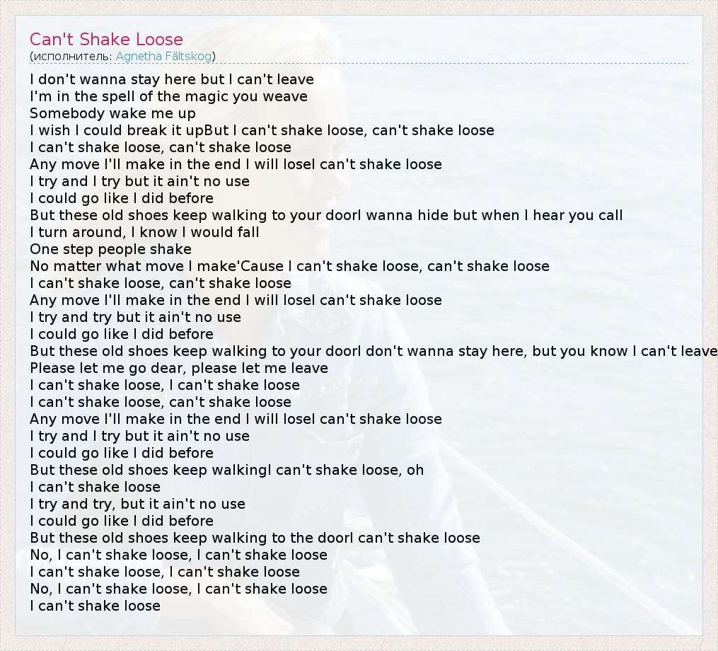 I don't wanna stay here but I can't leave I'm in the spell of the magic you weave Somebody wake me up I wish I could break it upBut I can't shake loose, can't shake loose I can't shake loose, can't shake loose Any move I'll make in the end I will loseI can't shake loose I try and I try but it ain't no use I could go like I did before But these old shoes keep walking to your doorI wanna hide but when I hear you call I turn around, I know I would fall One step people shake No matter what move I make'Cause I can't shake loose, can't shake loose I can't shake loose, can't shake loose Any move I'll make in the end I will loseI can't shake loose I try and try but it ain't no use I could go like I did before But these old shoes keep walking to your doorI don't wanna stay here, but you know I can't leave Please let me go dear, please let me leave I can't shake loose, I can't shake loose I can't shake loose, can't shake loose Any move I'll make in the end I will loseI can't shake loose I try and I try but it ain't no use I could go like I did before But these old shoes keep walkingI can't shake loose, oh I can't shake loose I try and try, but it ain't no use I could go like I did before But these old shoes keep walking to the doorI can't shake loose No, I can't shake loose, I can't shake loose I can't shake loose, I can't shake loose No, I can't shake loose, I can't shake loose I can't shake loose
