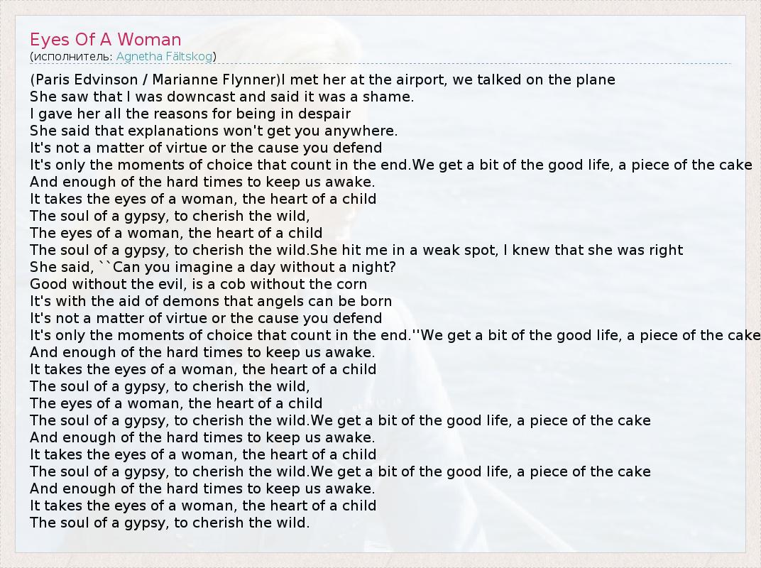 А как ты думаешь, о чем песня "Eyes Of A Woman" ?