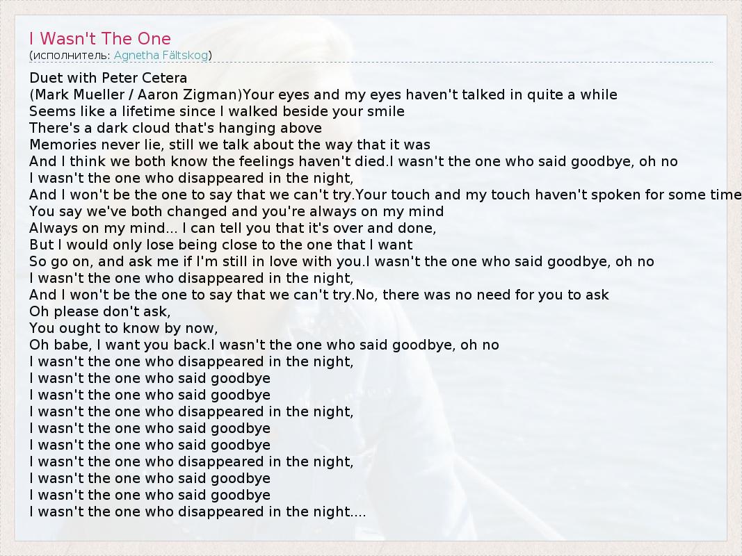Duet with Peter Cetera (Mark Mueller / Aaron Zigman)Your eyes and my eyes haven't talked in quite a while Seems like a lifetime since I walked beside your smile There's a dark cloud that's hanging above Memories never lie, still we talk about the way that it was And I think we both know the feelings haven't died.I wasn't the one who said goodbye, oh no I wasn't the one who disappeared in the night, And I won't be the one to say that we can't try.Your touch and my touch haven't spoken for some time You say we've both changed and you're always on my mind Always on my mind... I can tell you that it's over and done, But I would only lose being close to the one that I want So go on, and ask me if I'm still in love with you.I wasn't the one who said goodbye, oh no I wasn't the one who disappeared in the night, And I won't be the one to say that we can't try.No, there was no need for you to ask Oh please don't ask, You ought to know by now, Oh babe, I want you back.I wasn't the one who said goodbye, oh no I wasn't the one who disappeared in the night, I wasn't the one who said goodbye I wasn't the one who said goodbye I wasn't the one who disappeared in the night, I wasn't the one who said goodbye I wasn't the one who said goodbye I wasn't the one who disappeared in the night, I wasn't the one who said goodbye I wasn't the one who said goodbye I wasn't the one who disappeared in the night....