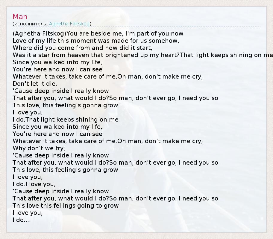 (Agnetha Fltskog)You are beside me, I'm part of you now Love of my life this moment was made for us somehow, Where did you come from and how did it start, Was it a star from heaven that brightened up my heart?That light keeps shining on me Since you walked into my life, You're here and now I can see Whatever it takes, take care of me.Oh man, don't make me cry, Don't let it die, 'Cause deep inside I really know That after you, what would I do?So man, don't ever go, I need you so This love, this feeling's gonna grow I love you, I do.That light keeps shining on me Since you walked into my life, You're here and now I can see Whatever it takes, take care of me.Oh man, don't make me cry, Why don't we try, 'Cause deep inside I really know That after you, what would I do?So man, don't ever go, I need you so This love, this feeling's gonna grow I love you, I do.I love you, 'Cause deep inside I really know That after you, what would I do?So man, don't ever go, I need you so This love this fellings going to grow I love you, I do....