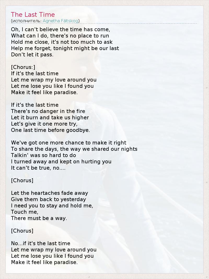 Oh, I can't believe the time has come, What can I do, there's no place to run Hold me close, it's not too much to ask Help me forget, tonight might be our last Don't let it pass. [Chorus:] If it's the last time Let me wrap my love around you Let me lose you like I found you Make it feel like paradise. If it's the last time There's no danger in the fire Let it burn and take us higher Let's give it one more try, One last time before goodbye. We've got one more chance to make it right To share the days, the way we shared our nights Talkin' was so hard to do I turned away and kept on hurting you It can't be true, no.... [Chorus] Let the heartaches fade away Give them back to yesterday I need you to stay and hold me, Touch me, There must be a way. [Chorus] No...if it's the last time Let me wrap my love around you Let me lose you like I found you Make it feel like paradise.