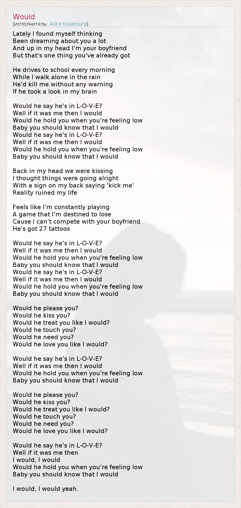 Lately I found myself thinking Been dreaming about you a lot And up in my head I'm your boyfriend But that's one thing you've already got He drives to school every morning While I walk alone in the rain He'd kill me without any warning If he took a look in my brain Would he say he's in L-O-V-E? Well if it was me then I would Would he hold you when you're feeling low Baby you should know that I would Would he say he's in L-O-V-E? Well if it was me then I would Would he hold you when you're feeling low Baby you should know that I would Back in my head we were kissing I thought things were going alright With a sign on my back saying 'kick me' Reality ruined my life Feels like I'm constantly playing A game that I'm destined to lose Cause I can't compete with your boyfriend He's got 27 tattoos Would he say he's in L-O-V-E? Well if it was me then I would Would he hold you when you're feeling low Baby you should know that I would Would he say he's in L-O-V-E? Well if it was me then I would Would he hold you when you're feeling low Baby you should know that I would Would he please you? Would he kiss you? Would he treat you like I would? Would he touch you? Would he need you? Would he love you like I would? Would he say he's in L-O-V-E? Well if it was me then I would Would he hold you when you're feeling low Baby you should know that I would Would he please you? Would he kiss you? Would he treat you like I would? Would he touch you? Would he need you? Would he love you like I would? Would he say he's in L-O-V-E? Well if it was me then I would, I would Would he hold you when you're feeling low Baby you should know that I would I would, I would yeah.