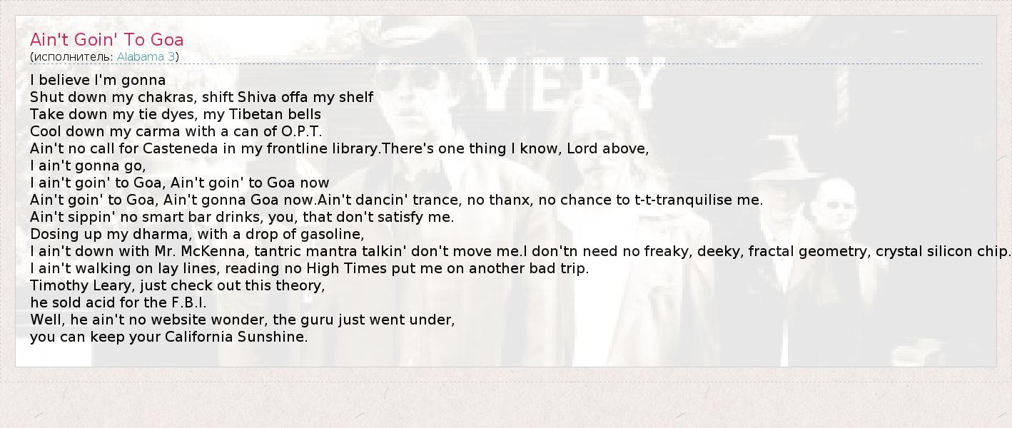 Ain't goin' to Goa, Ain't gonna Goa now.Ain't dancin' trance, no thanx, no chance to t-t-tranquilise me.