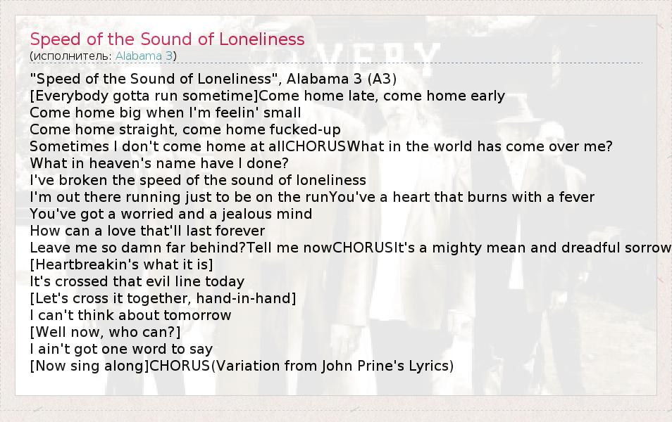 "Speed of the Sound of Loneliness", Alabama 3 (A3) [Everybody gotta run sometime]Come home late, come home early Come home big when I'm feelin' small Come home straight, come home fucked-up Sometimes I don't come home at allCHORUSWhat in the world has come over me? What in heaven's name have I done? I've broken the speed of the sound of loneliness I'm out there running just to be on the runYou've a heart that burns with a fever You've got a worried and a jealous mind How can a love that'll last forever Leave me so damn far behind?Tell me nowCHORUSIt's a mighty mean and dreadful sorrow [Heartbreakin's what it is] It's crossed that evil line today [Let's cross it together, hand-in-hand] I can't think about tomorrow [Well now, who can?] I ain't got one word to say [Now sing along]CHORUS(Variation from John Prine's Lyrics)