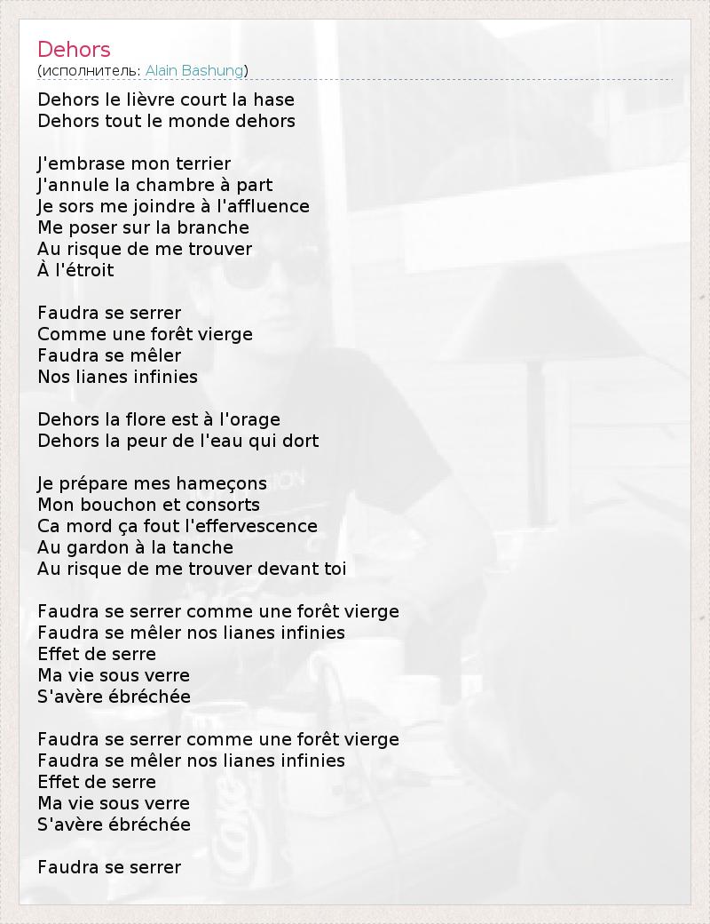 Dehors le lièvre court la hase Dehors tout le monde dehors J'embrase mon terrier J'annule la chambre à part Je sors me joindre à l'affluence Me poser sur la branche Au risque de me trouver À l'étroit Faudra se serrer Comme une forêt vierge Faudra se mêler Nos lianes infinies Dehors la flore est à l'orage Dehors la peur de l'eau qui dort Je prépare mes hameçons Mon bouchon et consorts Ca mord ça fout l'effervescence Au gardon à la tanche Au risque de me trouver devant toi Faudra se serrer comme une forêt vierge Faudra se mêler nos lianes infinies Effet de serre Ma vie sous verre S'avère ébréchée Faudra se serrer comme une forêt vierge Faudra se mêler nos lianes infinies Effet de serre Ma vie sous verre S'avère ébréchée Faudra se serrer