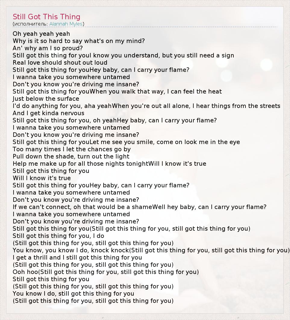Oh yeah yeah yeah Why is it so hard to say what's on my mind? An' why am I so proud? Still got this thing for youI know you understand, but you still need a sign Real love should shout out loud Still got this thing for youHey baby, can I carry your flame? I wanna take you somewhere untamed Don't you know you're driving me insane? Still got this thing for youWhen you walk that way, I can feel the heat Just below the surface I'd do anything for you, aha yeahWhen you're out all alone, I hear things from the streets And I get kinda nervous Still got this thing for you, oh yeahHey baby, can I carry your flame? I wanna take you somewhere untamed Don't you know you're driving me insane? Still got this thing for youLet me see you smile, come on look me in the eye Too many times I let the chances go by Pull down the shade, turn out the light Help me make up for all those nights tonightWill I know it's true Still got this thing for you Will I know it's true Still got this thing for youHey baby, can I carry your flame? I wanna take you somewhere untamed Don't you know you're driving me insane? If we can't connect, oh that would be a shameWell hey baby, can I carry your flame? I wanna take you somewhere untamed Don't you know you're driving me insane? Still got this thing for you(Still got this thing for you, still got this thing for you) Still got this thing for you, I do (Still got this thing for you, still got this thing for you) You know, you know I do, knock knock(Still got this thing for you, still got this thing for you) I get a thrill and I still got this thing for you (Still got this thing for you, still got this thing for you) Ooh hoo(Still got this thing for you, still got this thing for you) Still got this thing for you (Still got this thing for you, still got this thing for you) You know I do, still got this thing for you (Still got this thing for you, still got this thing for you)