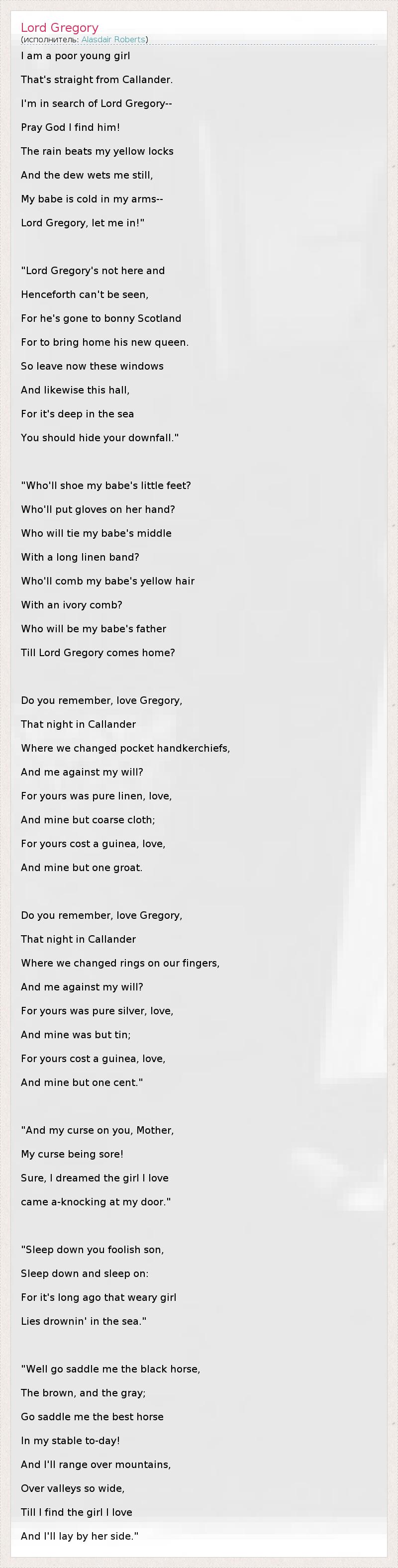 I am a poor young girl That's straight from Callander. I'm in search of Lord Gregory-- Pray God I find him! The rain beats my yellow locks And the dew wets me still, My babe is cold in my arms-- Lord Gregory, let me in!" "Lord Gregory's not here and Henceforth can't be seen, For he's gone to bonny Scotland For to bring home his new queen. So leave now these windows And likewise this hall, For it's deep in the sea You should hide your downfall." "Who'll shoe my babe's little feet? Who'll put gloves on her hand? Who will tie my babe's middle With a long linen band? Who'll comb my babe's yellow hair With an ivory comb? Who will be my babe's father Till Lord Gregory comes home? Do you remember, love Gregory, That night in Callander Where we changed pocket handkerchiefs, And me against my will? For yours was pure linen, love, And mine but coarse cloth; For yours cost a guinea, love, And mine but one groat. Do you remember, love Gregory, That night in Callander Where we changed rings on our fingers, And me against my will? For yours was pure silver, love, And mine was but tin; For yours cost a guinea, love, And mine but one cent." "And my curse on you, Mother, My curse being sore! Sure, I dreamed the girl I love came a-knocking at my door." "Sleep down you foolish son, Sleep down and sleep on: For it's long ago that weary girl Lies drownin' in the sea." "Well go saddle me the black horse, The brown, and the gray; Go saddle me the best horse In my stable to-day! And I'll range over mountains, Over valleys so wide, Till I find the girl I love And I'll lay by her side."