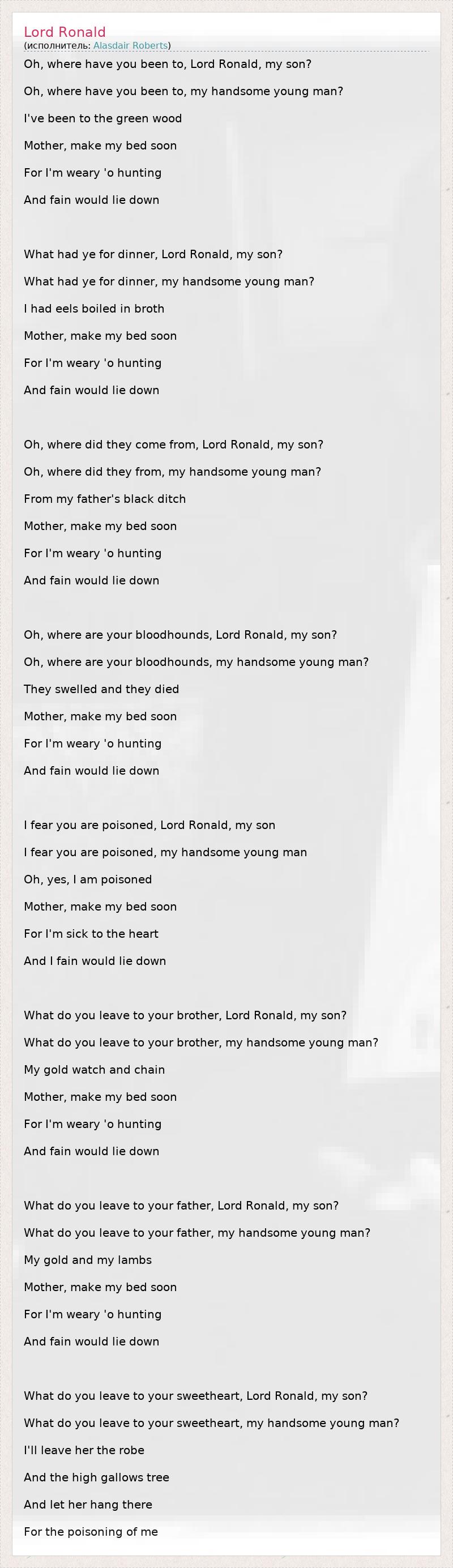 Oh, where have you been to, Lord Ronald, my son? Oh, where have you been to, my handsome young man? I've been to the green wood Mother, make my bed soon For I'm weary 'o hunting And fain would lie down What had ye for dinner, Lord Ronald, my son? What had ye for dinner, my handsome young man? I had eels boiled in broth Mother, make my bed soon For I'm weary 'o hunting And fain would lie down Oh, where did they come from, Lord Ronald, my son? Oh, where did they from, my handsome young man? From my father's black ditch Mother, make my bed soon For I'm weary 'o hunting And fain would lie down Oh, where are your bloodhounds, Lord Ronald, my son? Oh, where are your bloodhounds, my handsome young man? They swelled and they died Mother, make my bed soon For I'm weary 'o hunting And fain would lie down I fear you are poisoned, Lord Ronald, my son I fear you are poisoned, my handsome young man Oh, yes, I am poisoned Mother, make my bed soon For I'm sick to the heart And I fain would lie down What do you leave to your brother, Lord Ronald, my son? What do you leave to your brother, my handsome young man? My gold watch and chain Mother, make my bed soon For I'm weary 'o hunting And fain would lie down What do you leave to your father, Lord Ronald, my son? What do you leave to your father, my handsome young man? My gold and my lambs Mother, make my bed soon For I'm weary 'o hunting And fain would lie down What do you leave to your sweetheart, Lord Ronald, my son? What do you leave to your sweetheart, my handsome young man? I'll leave her the robe And the high gallows tree And let her hang there For the poisoning of me