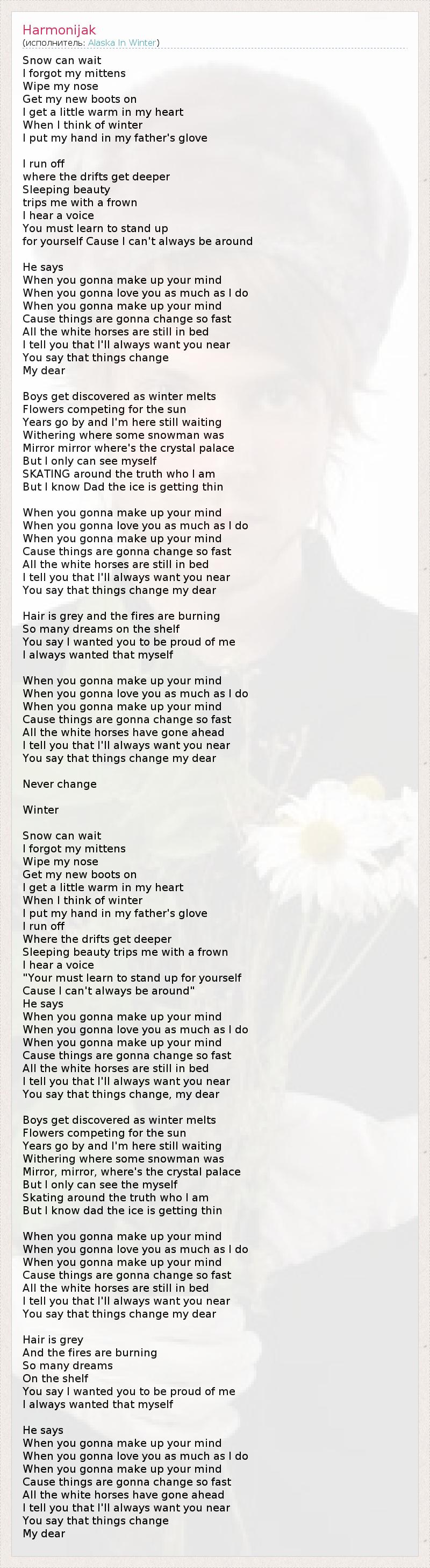 Snow can wait I forgot my mittens Wipe my nose Get my new boots on I get a little warm in my heart When I think of winter I put my hand in my father's glove I run off where the drifts get deeper Sleeping beauty trips me with a frown I hear a voice You must learn to stand up for yourself Cause I can't always be around He says When you gonna make up your mind When you gonna love you as much as I do When you gonna make up your mind Cause things are gonna change so fast All the white horses are still in bed I tell you that I'll always want you near You say that things change My dear Boys get discovered as winter melts Flowers competing for the sun Years go by and I'm here still waiting Withering where some snowman was Mirror mirror where's the crystal palace But I only can see myself SKATING around the truth who I am But I know Dad the ice is getting thin When you gonna make up your mind When you gonna love you as much as I do When you gonna make up your mind Cause things are gonna change so fast All the white horses are still in bed I tell you that I'll always want you near You say that things change my dear Hair is grey and the fires are burning So many dreams on the shelf You say I wanted you to be proud of me I always wanted that myself When you gonna make up your mind When you gonna love you as much as I do When you gonna make up your mind Cause things are gonna change so fast All the white horses have gone ahead I tell you that I'll always want you near You say that things change my dear Never change Winter Snow can wait I forgot my mittens Wipe my nose Get my new boots on I get a little warm in my heart When I think of winter I put my hand in my father's glove I run off Where the drifts get deeper Sleeping beauty trips me with a frown I hear a voice "Your must learn to stand up for yourself Cause I can't always be around" He says When you gonna make up your mind When you gonna love you as much as I do When you gonna make up your mind Cause things are gonna change so fast All the white horses are still in bed I tell you that I'll always want you near You say that things change, my dear Boys get discovered as winter melts Flowers competing for the sun Years go by and I'm here still waiting Withering where some snowman was Mirror, mirror, where's the crystal palace But I only can see the myself Skating around the truth who I am But I know dad the ice is getting thin When you gonna make up your mind When you gonna love you as much as I do When you gonna make up your mind Cause things are gonna change so fast All the white horses are still in bed I tell you that I'll always want you near You say that things change my dear Hair is grey And the fires are burning So many dreams On the shelf You say I wanted you to be proud of me I always wanted that myself He says When you gonna make up your mind When you gonna love you as much as I do When you gonna make up your mind Cause things are gonna change so fast All the white horses have gone ahead I tell you that I'll always want you near You say that things change My dear