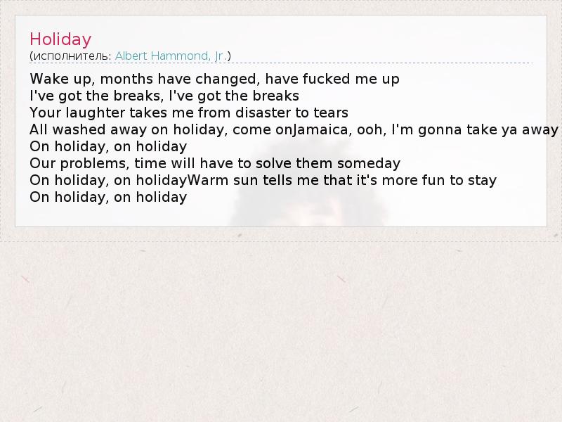 Wake up, months have changed, have fucked me up I've got the breaks, I've got the breaks Your laughter takes me from disaster to tears All washed away on holiday, come onJamaica, ooh, I'm gonna take ya away On holiday, on holiday Our problems, time will have to solve them someday On holiday, on holidayWarm sun tells me that it's more fun to stay On holiday, on holiday