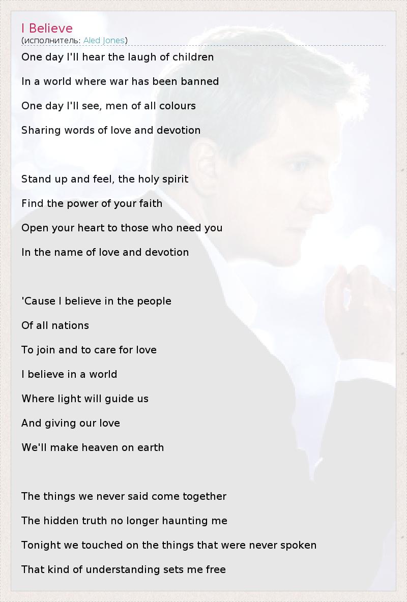 One day I'll hear the laugh of children In a world where war has been banned One day I'll see, men of all colours Sharing words of love and devotion Stand up and feel, the holy spirit Find the power of your faith Open your heart to those who need you In the name of love and devotion 'Cause I believe in the people Of all nations To join and to care for love I believe in a world Where light will guide us And giving our love We'll make heaven on earth The things we never said come together The hidden truth no longer haunting me Tonight we touched on the things that were never spoken That kind of understanding sets me free