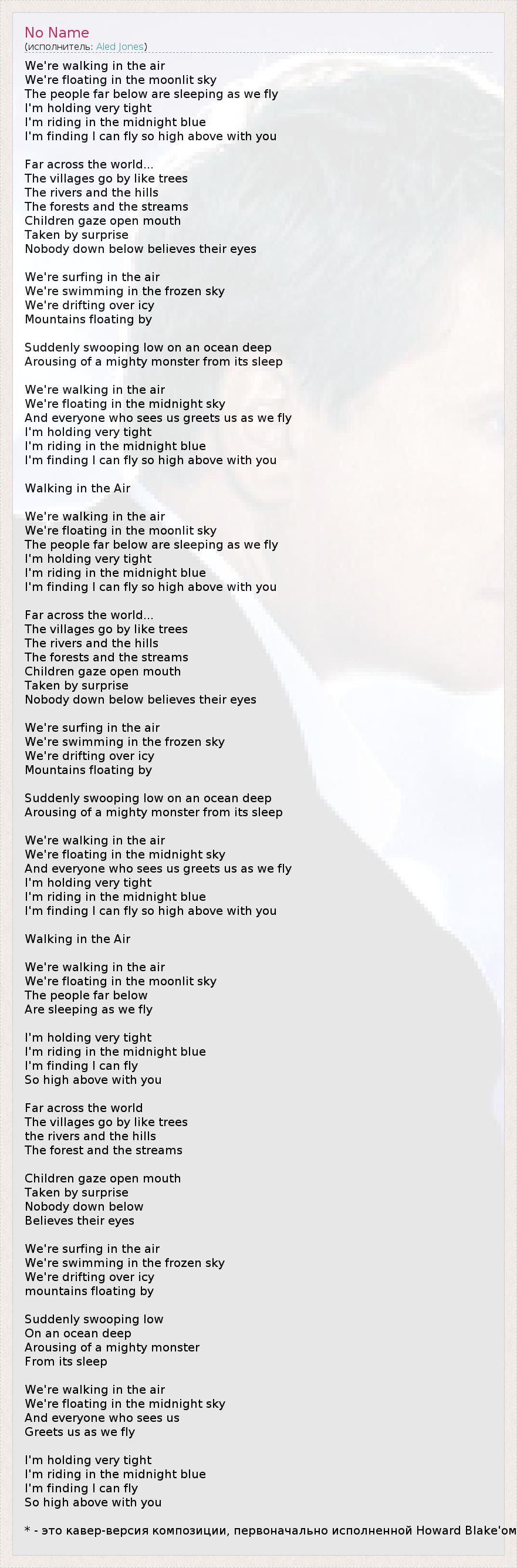 We're walking in the air We're floating in the moonlit sky The people far below are sleeping as we fly I'm holding very tight I'm riding in the midnight blue I'm finding I can fly so high above with you Far across the world... The villages go by like trees The rivers and the hills The forests and the streams Children gaze open mouth Taken by surprise Nobody down below believes their eyes We're surfing in the air We're swimming in the frozen sky We're drifting over icy Mountains floating by Suddenly swooping low on an ocean deep Arousing of a mighty monster from its sleep We're walking in the air We're floating in the midnight sky And everyone who sees us greets us as we fly I'm holding very tight I'm riding in the midnight blue I'm finding I can fly so high above with you Walking in the Air We're walking in the air We're floating in the moonlit sky The people far below are sleeping as we fly I'm holding very tight I'm riding in the midnight blue I'm finding I can fly so high above with you Far across the world... The villages go by like trees The rivers and the hills The forests and the streams Children gaze open mouth Taken by surprise Nobody down below believes their eyes We're surfing in the air We're swimming in the frozen sky We're drifting over icy Mountains floating by Suddenly swooping low on an ocean deep Arousing of a mighty monster from its sleep We're walking in the air We're floating in the midnight sky And everyone who sees us greets us as we fly I'm holding very tight I'm riding in the midnight blue I'm finding I can fly so high above with you Walking in the Air We're walking in the air We're floating in the moonlit sky The people far below Are sleeping as we fly I'm holding very tight I'm riding in the midnight blue I'm finding I can fly So high above with you Far across the world The villages go by like trees the rivers and the hills The forest and the streams Children gaze open mouth Taken by surprise Nobody down below Believes their eyes We're surfing in the air We're swimming in the frozen sky We're drifting over icy mountains floating by Suddenly swooping low On an ocean deep Arousing of a mighty monster From its sleep We're walking in the air We're floating in the midnight sky And everyone who sees us Greets us as we fly I'm holding very tight I'm riding in the midnight blue I'm finding I can fly So high above with you * - это кавер-версия композиции, первоначально исполненной Howard Blake'ом