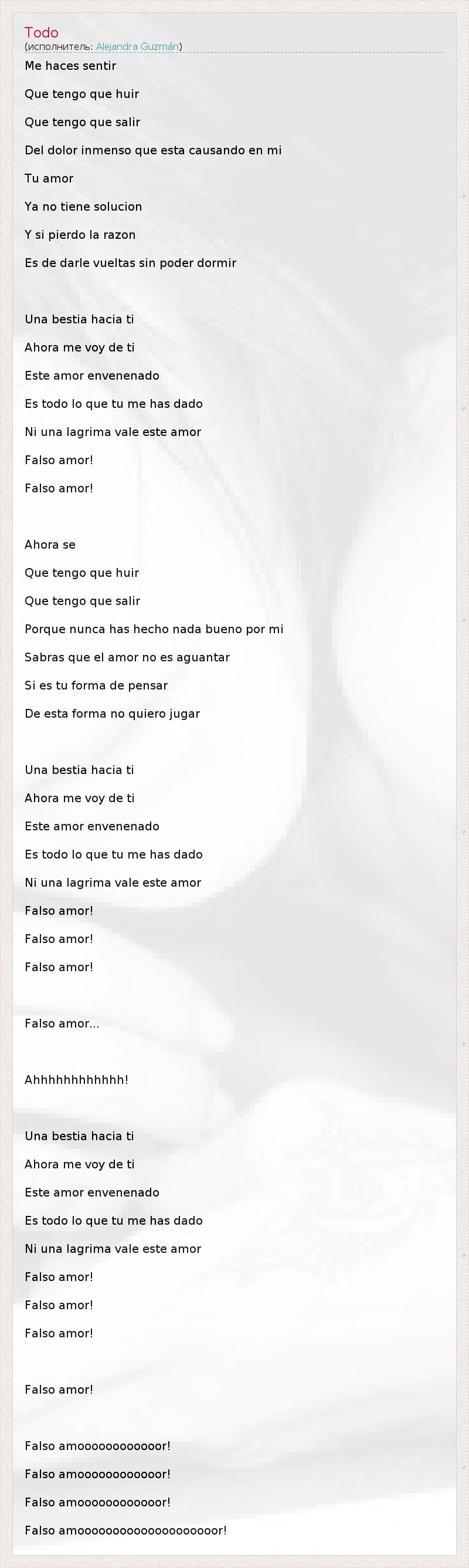 Me haces sentir Que tengo que huir Que tengo que salir Del dolor inmenso que esta causando en mi Tu amor Ya no tiene solucion Y si pierdo la razon Es de darle vueltas sin poder dormir Una bestia hacia ti Ahora me voy de ti Este amor envenenado Es todo lo que tu me has dado Ni una lagrima vale este amor Falso amor! Falso amor! Ahora se Que tengo que huir Que tengo que salir Porque nunca has hecho nada bueno por mi Sabras que el amor no es aguantar Si es tu forma de pensar De esta forma no quiero jugar Una bestia hacia ti Ahora me voy de ti Este amor envenenado Es todo lo que tu me has dado Ni una lagrima vale este amor Falso amor! Falso amor! Falso amor! Falso amor... Ahhhhhhhhhhhh! Una bestia hacia ti Ahora me voy de ti Este amor envenenado Es todo lo que tu me has dado Ni una lagrima vale este amor Falso amor! Falso amor! Falso amor! Falso amor! Falso amoooooooooooor! Falso amoooooooooooor! Falso amoooooooooooor! Falso amoooooooooooooooooooor!