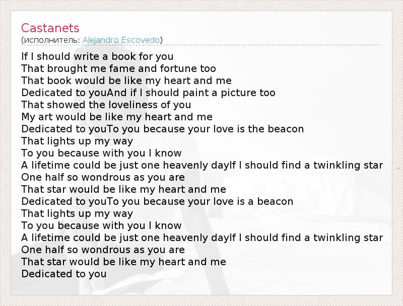If I should write a book for you That brought me fame and fortune too That book would be like my heart and me Dedicated to youAnd if I should paint a picture too That showed the loveliness of you My art would be like my heart and me Dedicated to youTo you because your love is the beacon That lights up my way To you because with you I know A lifetime could be just one heavenly dayIf I should find a twinkling star One half so wondrous as you are That star would be like my heart and me Dedicated to youTo you because your love is a beacon That lights up my way To you because with you I know A lifetime could be just one heavenly dayIf I should find a twinkling star One half so wondrous as you are That star would be like my heart and me Dedicated to you
