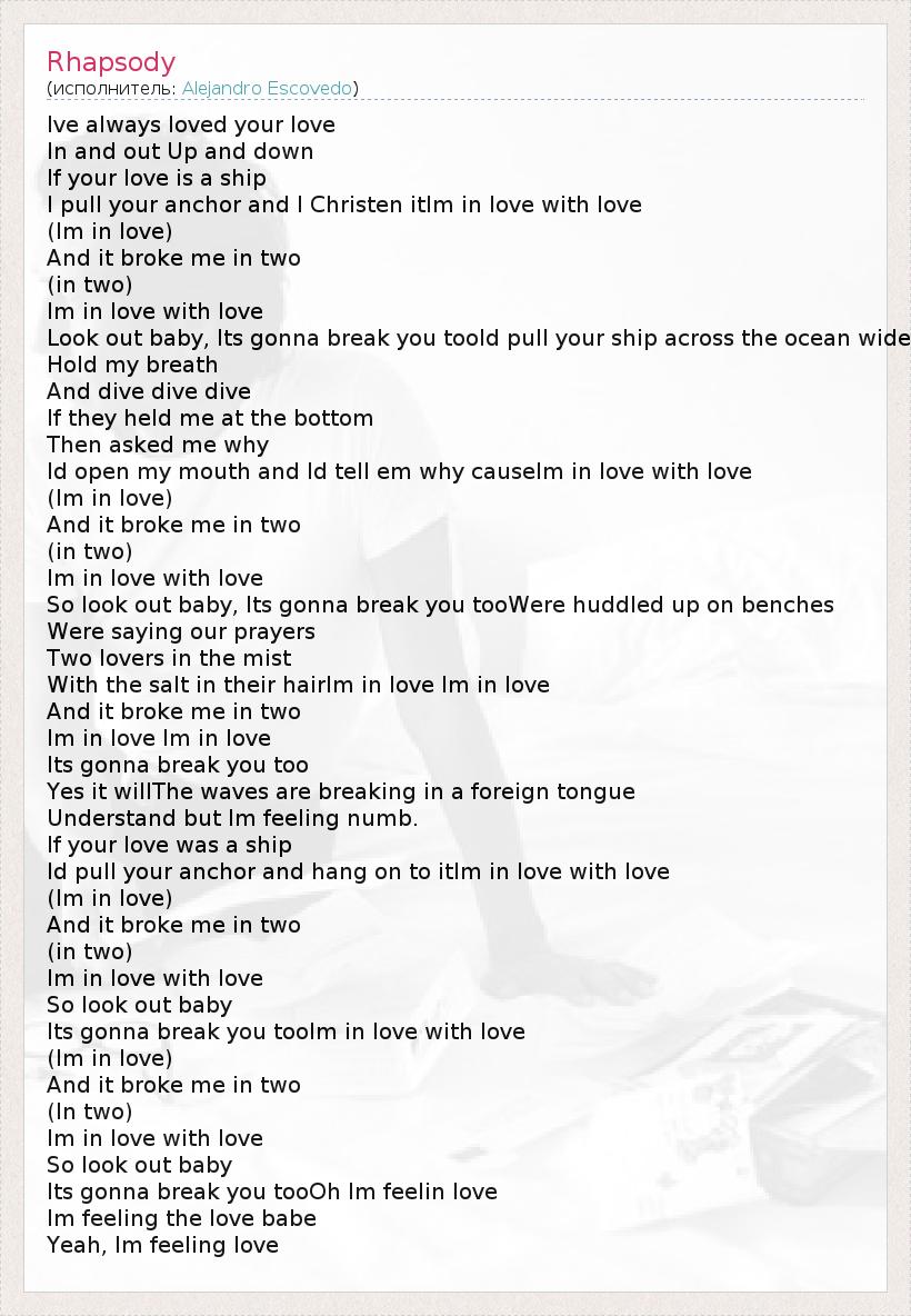 Ive always loved your love In and out Up and down If your love is a ship I pull your anchor and I Christen itIm in love with love (Im in love) And it broke me in two (in two) Im in love with love Look out baby, Its gonna break you tooId pull your ship across the ocean wide Hold my breath And dive dive dive If they held me at the bottom Then asked me why Id open my mouth and Id tell em why causeIm in love with love (Im in love) And it broke me in two (in two) Im in love with love So look out baby, Its gonna break you tooWere huddled up on benches Were saying our prayers Two lovers in the mist With the salt in their hairIm in love Im in love And it broke me in two Im in love Im in love Its gonna break you too Yes it willThe waves are breaking in a foreign tongue Understand but Im feeling numb. If your love was a ship Id pull your anchor and hang on to itIm in love with love (Im in love) And it broke me in two (in two) Im in love with love So look out baby Its gonna break you tooIm in love with love (Im in love) And it broke me in two (In two) Im in love with love So look out baby Its gonna break you tooOh Im feelin love Im feeling the love babe Yeah, Im feeling love
