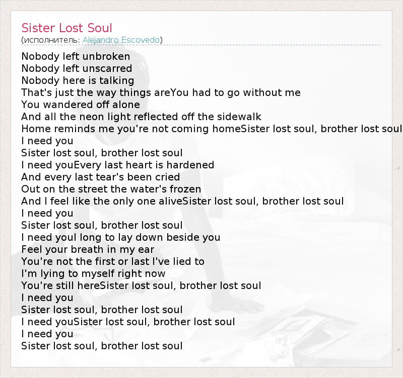 Nobody left unbroken Nobody left unscarred Nobody here is talking That's just the way things areYou had to go without me You wandered off alone And all the neon light reflected off the sidewalk Home reminds me you're not coming homeSister lost soul, brother lost soul I need you Sister lost soul, brother lost soul I need youEvery last heart is hardened And every last tear's been cried Out on the street the water's frozen And I feel like the only one aliveSister lost soul, brother lost soul I need you Sister lost soul, brother lost soul I need youI long to lay down beside you Feel your breath in my ear You're not the first or last I've lied to I'm lying to myself right now You're still hereSister lost soul, brother lost soul I need you Sister lost soul, brother lost soul I need youSister lost soul, brother lost soul I need you Sister lost soul, brother lost soul