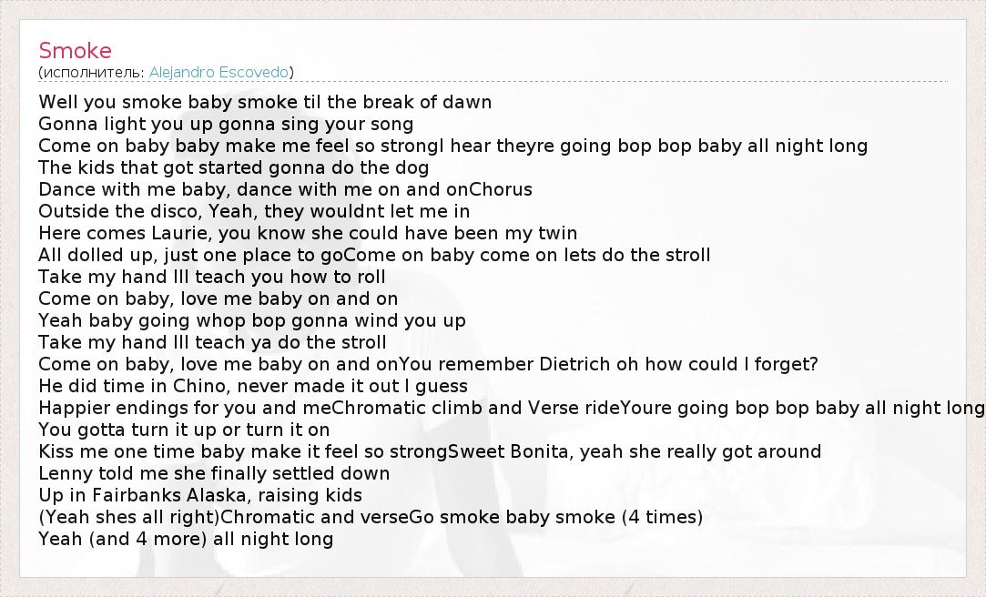 Well you smoke baby smoke til the break of dawn Gonna light you up gonna sing your song Come on baby baby make me feel so strongI hear theyre going bop bop baby all night long The kids that got started gonna do the dog Dance with me baby, dance with me on and onChorus Outside the disco, Yeah, they wouldnt let me in Here comes Laurie, you know she could have been my twin All dolled up, just one place to goCome on baby come on lets do the stroll Take my hand Ill teach you how to roll Come on baby, love me baby on and on Yeah baby going whop bop gonna wind you up Take my hand Ill teach ya do the stroll Come on baby, love me baby on and onYou remember Dietrich oh how could I forget? He did time in Chino, never made it out I guess Happier endings for you and meChromatic climb and Verse rideYoure going bop bop baby all night long You gotta turn it up or turn it on Kiss me one time baby make it feel so strongSweet Bonita, yeah she really got around Lenny told me she finally settled down Up in Fairbanks Alaska, raising kids (Yeah shes all right)Chromatic and verseGo smoke baby smoke (4 times) Yeah (and 4 more) all night long
