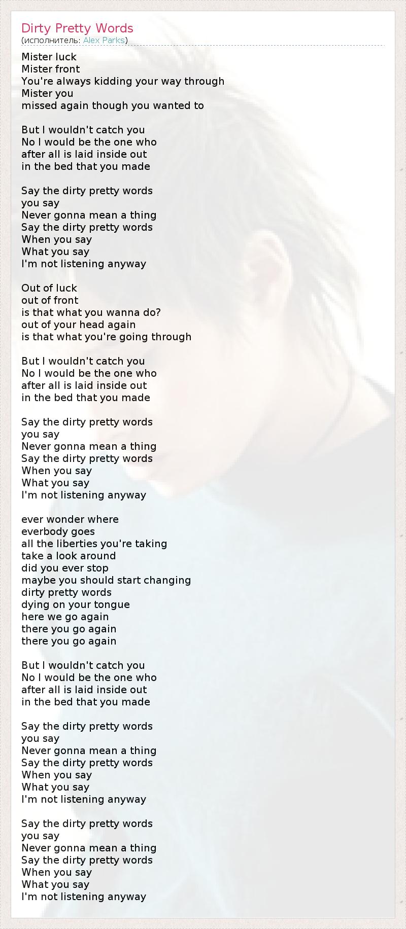 Mister luck Mister front You're always kidding your way through Mister you missed again though you wanted to But I wouldn't catch you No I would be the one who after all is laid inside out in the bed that you made Say the dirty pretty words you say Never gonna mean a thing Say the dirty pretty words When you say What you say I'm not listening anyway Out of luck out of front is that what you wanna do? out of your head again is that what you're going through But I wouldn't catch you No I would be the one who after all is laid inside out in the bed that you made Say the dirty pretty words you say Never gonna mean a thing Say the dirty pretty words When you say What you say I'm not listening anyway ever wonder where everbody goes all the liberties you're taking take a look around did you ever stop maybe you should start changing dirty pretty words dying on your tongue here we go again there you go again there you go again But I wouldn't catch you No I would be the one who after all is laid inside out in the bed that you made Say the dirty pretty words you say Never gonna mean a thing Say the dirty pretty words When you say What you say I'm not listening anyway Say the dirty pretty words you say Never gonna mean a thing Say the dirty pretty words When you say What you say I'm not listening anyway
