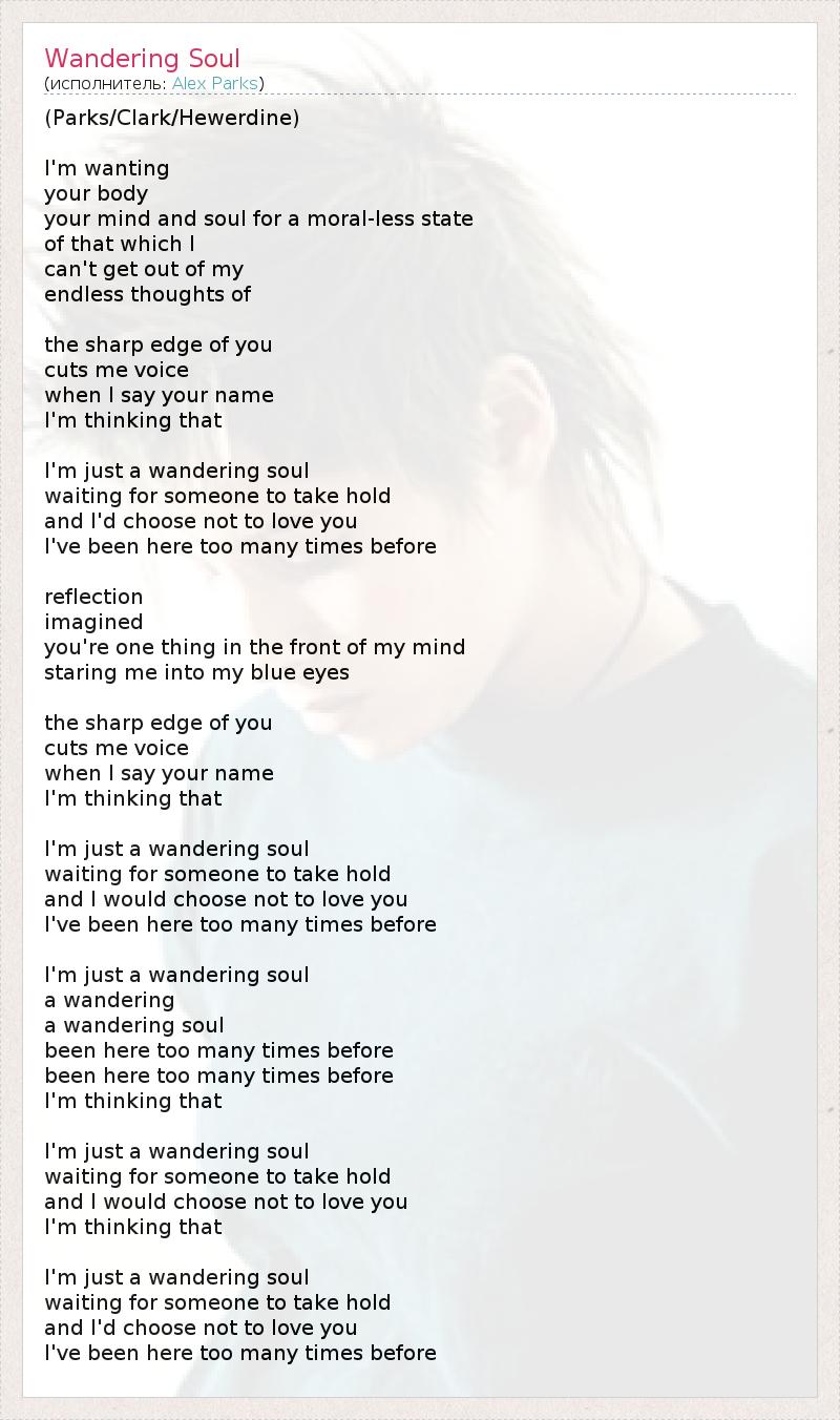 (Parks/Clark/Hewerdine) I'm wanting your body your mind and soul for a moral-less state of that which I can't get out of my endless thoughts of the sharp edge of you cuts me voice when I say your name I'm thinking that I'm just a wandering soul waiting for someone to take hold and I'd choose not to love you I've been here too many times before reflection imagined you're one thing in the front of my mind staring me into my blue eyes the sharp edge of you cuts me voice when I say your name I'm thinking that I'm just a wandering soul waiting for someone to take hold and I would choose not to love you I've been here too many times before I'm just a wandering soul a wandering a wandering soul been here too many times before been here too many times before I'm thinking that I'm just a wandering soul waiting for someone to take hold and I would choose not to love you I'm thinking that I'm just a wandering soul waiting for someone to take hold and I'd choose not to love you I've been here too many times before