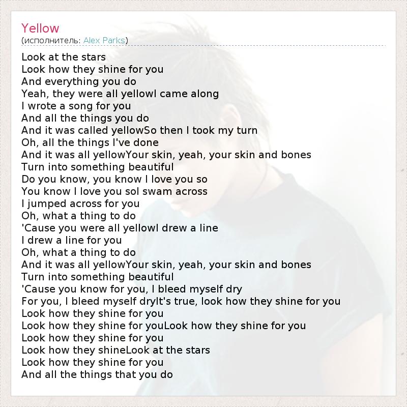 Look at the stars Look how they shine for you And everything you do Yeah, they were all yellowI came along I wrote a song for you And all the things you do And it was called yellowSo then I took my turn Oh, all the things I've done And it was all yellowYour skin, yeah, your skin and bones Turn into something beautiful Do you know, you know I love you so You know I love you soI swam across I jumped across for you Oh, what a thing to do 'Cause you were all yellowI drew a line I drew a line for you Oh, what a thing to do And it was all yellowYour skin, yeah, your skin and bones Turn into something beautiful 'Cause you know for you, I bleed myself dry For you, I bleed myself dryIt's true, look how they shine for you Look how they shine for you Look how they shine for youLook how they shine for you Look how they shine for you Look how they shineLook at the stars Look how they shine for you And all the things that you do