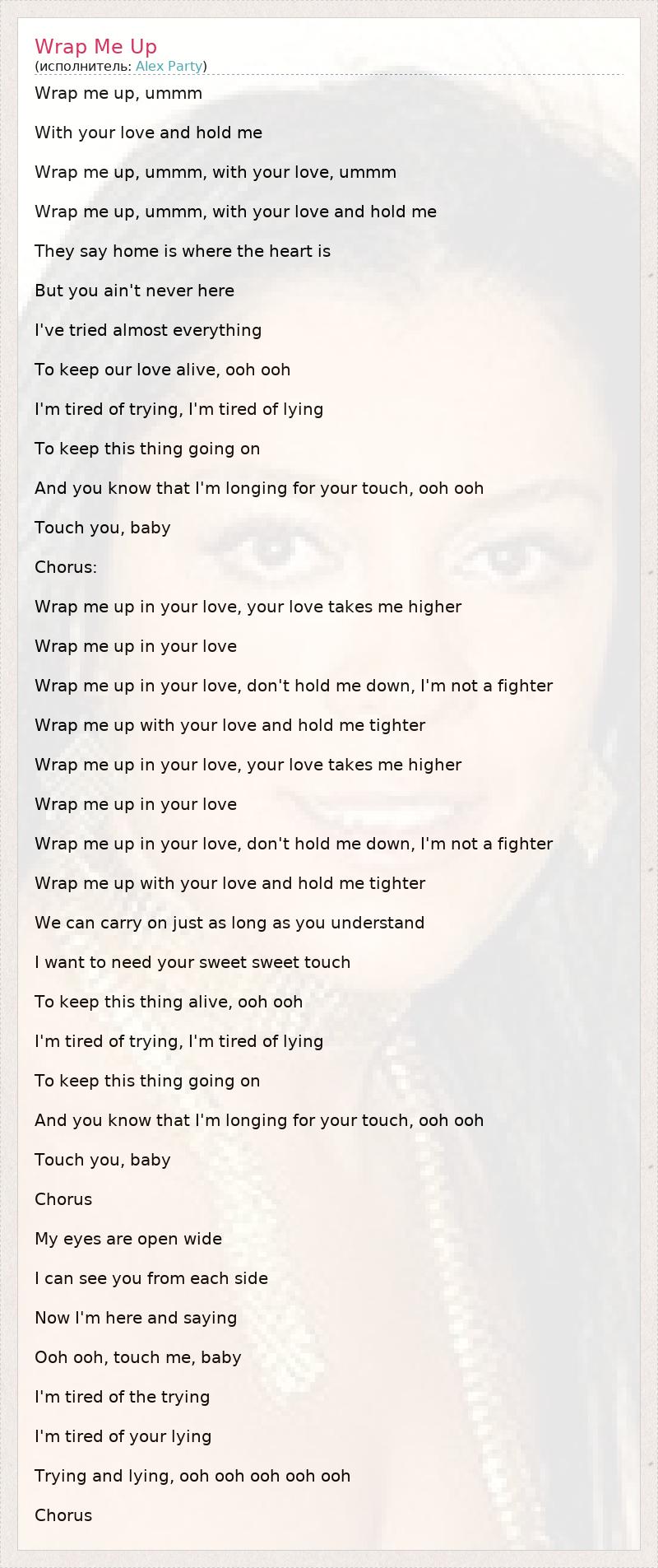 Wrap me up, ummm With your love and hold me Wrap me up, ummm, with your love, ummm Wrap me up, ummm, with your love and hold me They say home is where the heart is But you ain't never here I've tried almost everything To keep our love alive, ooh ooh I'm tired of trying, I'm tired of lying To keep this thing going on And you know that I'm longing for your touch, ooh ooh Touch you, baby Chorus: Wrap me up in your love, your love takes me higher Wrap me up in your love Wrap me up in your love, don't hold me down, I'm not a fighter Wrap me up with your love and hold me tighter Wrap me up in your love, your love takes me higher Wrap me up in your love Wrap me up in your love, don't hold me down, I'm not a fighter Wrap me up with your love and hold me tighter We can carry on just as long as you understand I want to need your sweet sweet touch To keep this thing alive, ooh ooh I'm tired of trying, I'm tired of lying To keep this thing going on And you know that I'm longing for your touch, ooh ooh Touch you, baby Chorus My eyes are open wide I can see you from each side Now I'm here and saying Ooh ooh, touch me, baby I'm tired of the trying I'm tired of your lying Trying and lying, ooh ooh ooh ooh ooh Chorus