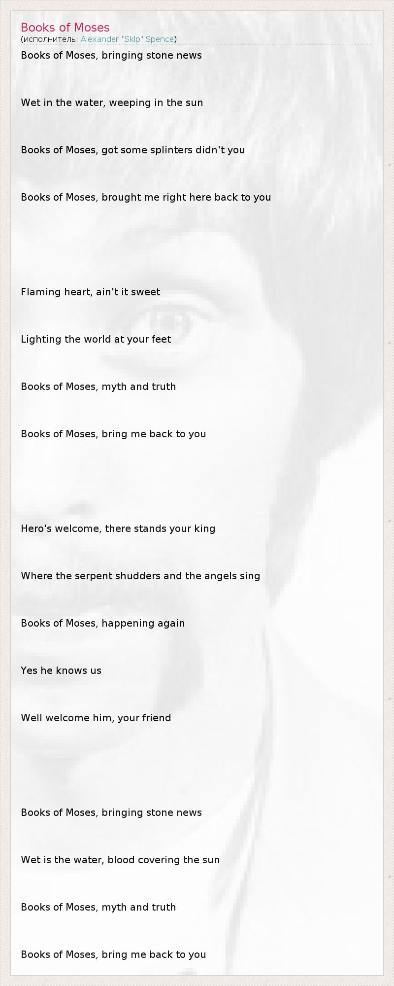 Books of Moses, bringing stone news Wet in the water, weeping in the sun Books of Moses, got some splinters didn't you Books of Moses, brought me right here back to you Flaming heart, ain't it sweet Lighting the world at your feet Books of Moses, myth and truth Books of Moses, bring me back to you Hero's welcome, there stands your king Where the serpent shudders and the angels sing Books of Moses, happening again Yes he knows us Well welcome him, your friend Books of Moses, bringing stone news Wet is the water, blood covering the sun Books of Moses, myth and truth Books of Moses, bring me back to you