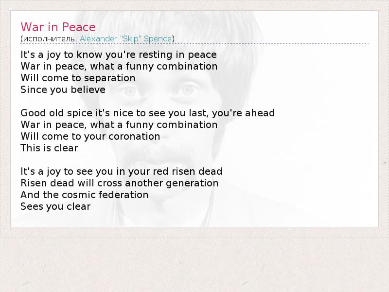 It's a joy to know you're resting in peace War in peace, what a funny combination Will come to separation Since you believe Good old spice it's nice to see you last, you're ahead War in peace, what a funny combination Will come to your coronation This is clear It's a joy to see you in your red risen dead Risen dead will cross another generation And the cosmic federation Sees you clear