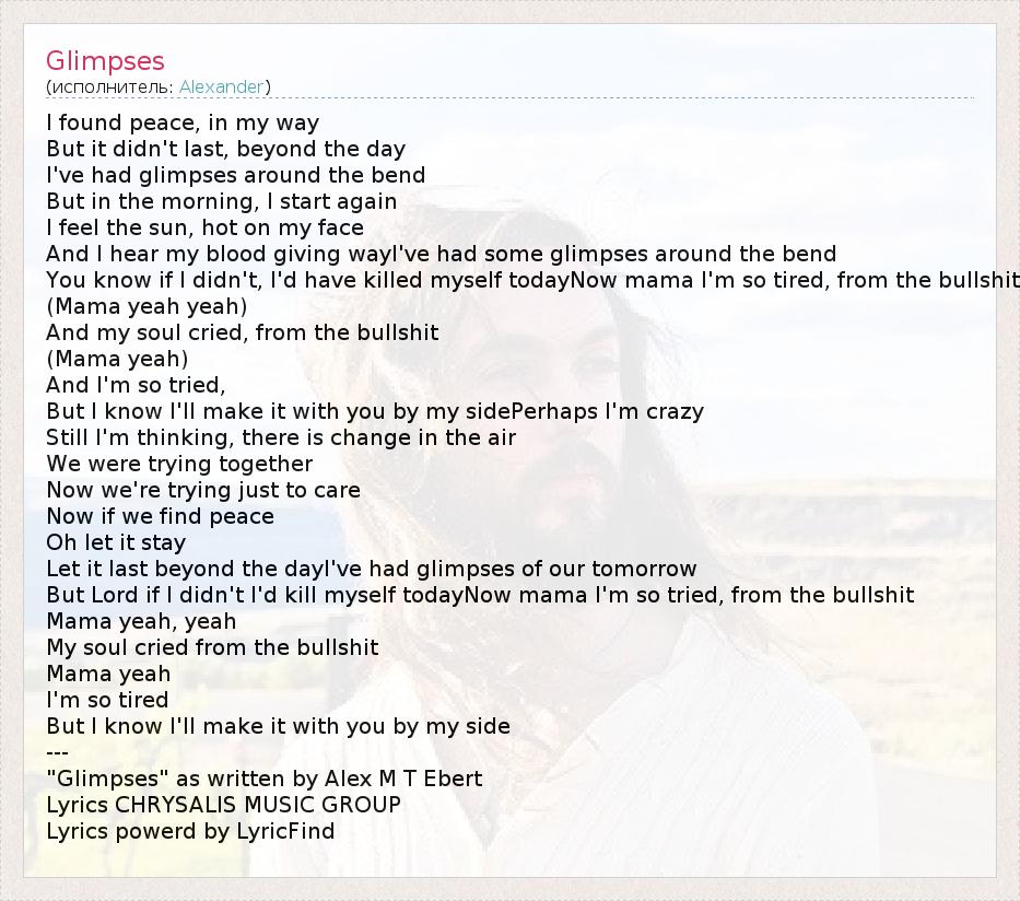I found peace, in my way But it didn't last, beyond the day I've had glimpses around the bend But in the morning, I start again I feel the sun, hot on my face And I hear my blood giving wayI've had some glimpses around the bend You know if I didn't, I'd have killed myself todayNow mama I'm so tired, from the bullshit (Mama yeah yeah) And my soul cried, from the bullshit (Mama yeah) And I'm so tried, But I know I'll make it with you by my sidePerhaps I'm crazy Still I'm thinking, there is change in the air We were trying together Now we're trying just to care Now if we find peace Oh let it stay Let it last beyond the dayI've had glimpses of our tomorrow But Lord if I didn't I'd kill myself todayNow mama I'm so tried, from the bullshit Mama yeah, yeah My soul cried from the bullshit Mama yeah I'm so tired But I know I'll make it with you by my side --- "Glimpses" as written by Alex M T Ebert Lyrics CHRYSALIS MUSIC GROUP Lyrics powerd by LyricFind