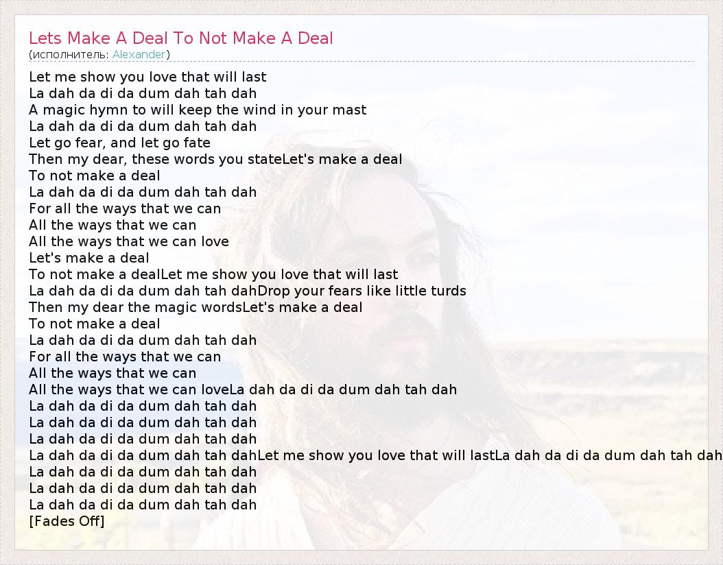 Let me show you love that will last La dah da di da dum dah tah dah A magic hymn to will keep the wind in your mast La dah da di da dum dah tah dah Let go fear, and let go fate Then my dear, these words you stateLet's make a deal To not make a deal La dah da di da dum dah tah dah For all the ways that we can All the ways that we can All the ways that we can love Let's make a deal To not make a dealLet me show you love that will last La dah da di da dum dah tah dahDrop your fears like little turds Then my dear the magic wordsLet's make a deal To not make a deal La dah da di da dum dah tah dah For all the ways that we can All the ways that we can All the ways that we can loveLa dah da di da dum dah tah dah La dah da di da dum dah tah dah La dah da di da dum dah tah dah La dah da di da dum dah tah dah La dah da di da dum dah tah dahLet me show you love that will lastLa dah da di da dum dah tah dah La dah da di da dum dah tah dah La dah da di da dum dah tah dah La dah da di da dum dah tah dah [Fades Off]