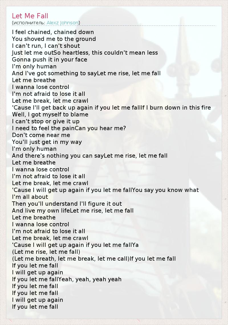 I feel chained, chained down You shoved me to the ground I can't run, I can't shout Just let me outSo heartless, this couldn't mean less Gonna push it in your face I'm only human And I've got something to sayLet me rise, let me fall Let me breathe I wanna lose control I'm not afraid to lose it all Let me break, let me crawl 'Cause I'll get back up again if you let me fallIf I burn down in this fire Well, I got myself to blame I can't stop or give it up I need to feel the painCan you hear me? Don't come near me You'll just get in my way I'm only human And there's nothing you can sayLet me rise, let me fall Let me breathe I wanna lose control I'm not afraid to lose it all Let me break, let me crawl 'Cause I will get up again if you let me fallYou say you know what I'm all about Then you'll understand I'll figure it out And live my own lifeLet me rise, let me fall Let me breathe I wanna lose control I'm not afraid to lose it all Let me break, let me crawl 'Cause I will get up again if you let me fallYa (Let me rise, let me fall) (Let me breath, let me break, let me call)If you let me fall If you let me fall I will get up again If you let me fallYeah, yeah, yeah yeah If you let me fall If you let me fall I will get up again If you let me fall