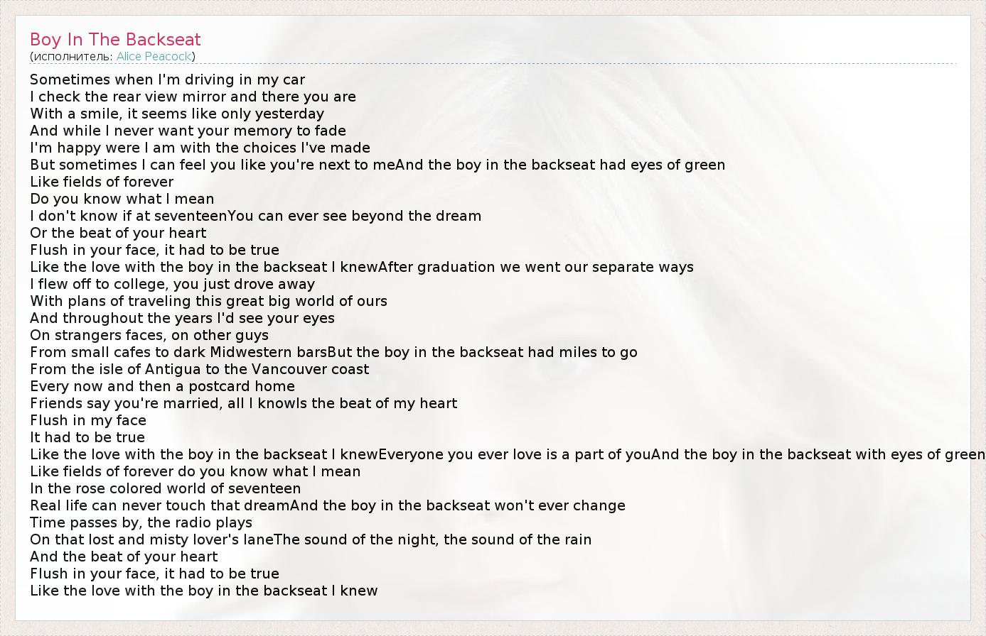 Sometimes when I'm driving in my car I check the rear view mirror and there you are With a smile, it seems like only yesterday And while I never want your memory to fade I'm happy were I am with the choices I've made But sometimes I can feel you like you're next to meAnd the boy in the backseat had eyes of green Like fields of forever Do you know what I mean I don't know if at seventeenYou can ever see beyond the dream Or the beat of your heart Flush in your face, it had to be true Like the love with the boy in the backseat I knewAfter graduation we went our separate ways I flew off to college, you just drove away With plans of traveling this great big world of ours And throughout the years I'd see your eyes On strangers faces, on other guys From small cafes to dark Midwestern barsBut the boy in the backseat had miles to go From the isle of Antigua to the Vancouver coast Every now and then a postcard home Friends say you're married, all I knowIs the beat of my heart Flush in my face It had to be true Like the love with the boy in the backseat I knewEveryone you ever love is a part of youAnd the boy in the backseat with eyes of green Like fields of forever do you know what I mean In the rose colored world of seventeen Real life can never touch that dreamAnd the boy in the backseat won't ever change Time passes by, the radio plays On that lost and misty lover's laneThe sound of the night, the sound of the rain And the beat of your heart Flush in your face, it had to be true Like the love with the boy in the backseat I knew