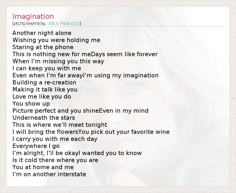 Another night alone Wishing you were holding me Staring at the phone This is nothing new for meDays seem like forever When I'm missing you this way I can keep you with me Even when I'm far awayI'm using my imagination Building a re-creation Making it talk like you Love me like you do You show up Picture perfect and you shineEven in my mind Underneath the stars This is where we'll meet tonight I will bring the flowersYou pick out your favorite wine I carry you with me each day Everywhere I go I'm alright, I'll be okayI wanted you to know Is it cold there where you are You at home and me I'm on another interstate