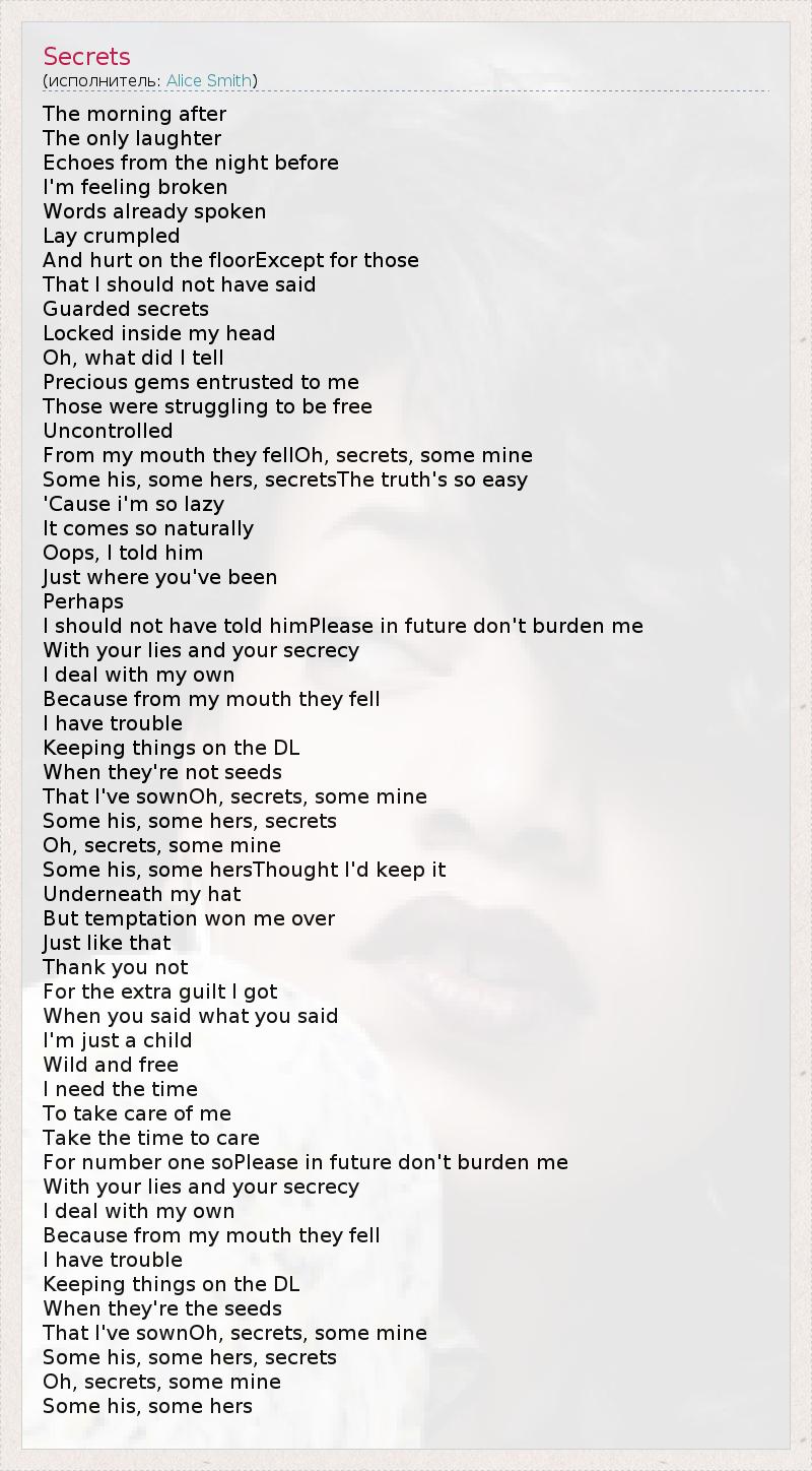 The morning after The only laughter Echoes from the night before I'm feeling broken Words already spoken Lay crumpled And hurt on the floorExcept for those That I should not have said Guarded secrets Locked inside my head Oh, what did I tell Precious gems entrusted to me Those were struggling to be free Uncontrolled From my mouth they fellOh, secrets, some mine Some his, some hers, secretsThe truth's so easy 'Cause i'm so lazy It comes so naturally Oops, I told him Just where you've been Perhaps I should not have told himPlease in future don't burden me With your lies and your secrecy I deal with my own Because from my mouth they fell I have trouble Keeping things on the DL When they're not seeds That I've sownOh, secrets, some mine Some his, some hers, secrets Oh, secrets, some mine Some his, some hersThought I'd keep it Underneath my hat But temptation won me over Just like that Thank you not For the extra guilt I got When you said what you said I'm just a child Wild and free I need the time To take care of me Take the time to care For number one soPlease in future don't burden me With your lies and your secrecy I deal with my own Because from my mouth they fell I have trouble Keeping things on the DL When they're the seeds That I've sownOh, secrets, some mine Some his, some hers, secrets Oh, secrets, some mine Some his, some hers