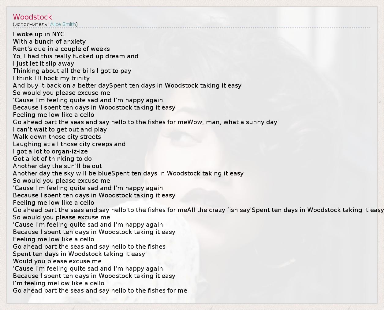I woke up in NYC With a bunch of anxiety Rent's due in a couple of weeks Yo, I had this really fucked up dream and I just let it slip away Thinking about all the bills I got to pay I think I'll hock my trinity And buy it back on a better daySpent ten days in Woodstock taking it easy So would you please excuse me 'Cause I'm feeling quite sad and I'm happy again Because I spent ten days in Woodstock taking it easy Feeling mellow like a cello Go ahead part the seas and say hello to the fishes for meWow, man, what a sunny day I can't wait to get out and play Walk down those city streets Laughing at all those city creeps and I got a lot to organ-iz-ize Got a lot of thinking to do Another day the sun'll be out Another day the sky will be blueSpent ten days in Woodstock taking it easy So would you please excuse me 'Cause I'm feeling quite sad and I'm happy again Because I spent ten days in Woodstock taking it easy Feeling mellow like a cello Go ahead part the seas and say hello to the fishes for meAll the crazy fish say'Spent ten days in Woodstock taking it easy So would you please excuse me 'Cause I'm feeling quite sad and I'm happy again Because I spent ten days in Woodstock taking it easy Feeling mellow like a cello Go ahead part the seas and say hello to the fishes Spent ten days in Woodstock taking it easy Would you please excuse me 'Cause I'm feeling quite sad and I'm happy again Because I spent ten days in Woodstock taking it easy I'm feeling mellow like a cello Go ahead part the seas and say hello to the fishes for me