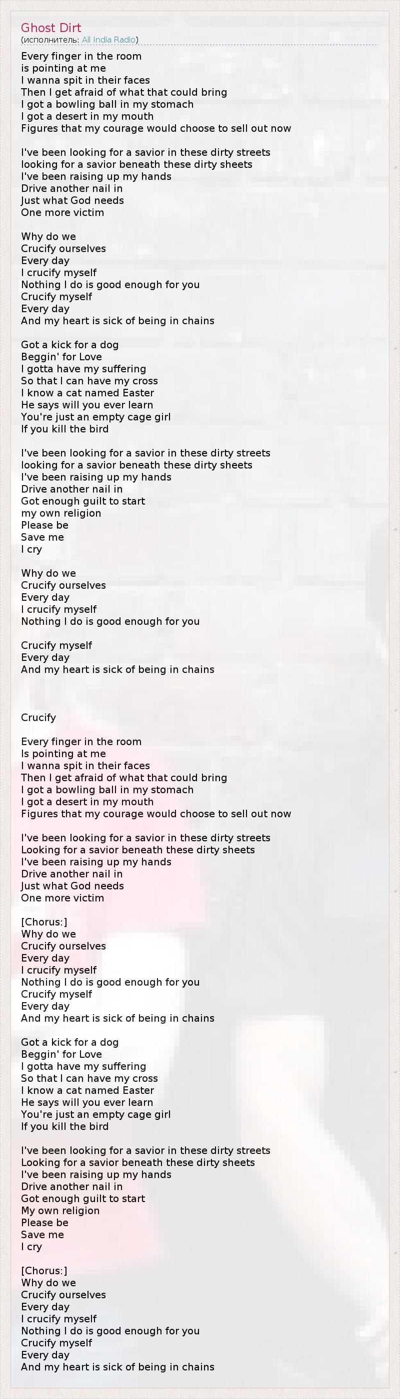 Every finger in the room is pointing at me I wanna spit in their faces Then I get afraid of what that could bring I got a bowling ball in my stomach I got a desert in my mouth Figures that my courage would choose to sell out now I've been looking for a savior in these dirty streets looking for a savior beneath these dirty sheets I've been raising up my hands Drive another nail in Just what God needs One more victim Why do we Crucify ourselves Every day I crucify myself Nothing I do is good enough for you Crucify myself Every day And my heart is sick of being in chains Got a kick for a dog Beggin' for Love I gotta have my suffering So that I can have my cross I know a cat named Easter He says will you ever learn You're just an empty cage girl If you kill the bird I've been looking for a savior in these dirty streets looking for a savior beneath these dirty sheets I've been raising up my hands Drive another nail in Got enough guilt to start my own religion Please be Save me I cry Why do we Crucify ourselves Every day I crucify myself Nothing I do is good enough for you Crucify myself Every day And my heart is sick of being in chains Crucify Every finger in the room Is pointing at me I wanna spit in their faces Then I get afraid of what that could bring I got a bowling ball in my stomach I got a desert in my mouth Figures that my courage would choose to sell out now I've been looking for a savior in these dirty streets Looking for a savior beneath these dirty sheets I've been raising up my hands Drive another nail in Just what God needs One more victim [Chorus:] Why do we Crucify ourselves Every day I crucify myself Nothing I do is good enough for you Crucify myself Every day And my heart is sick of being in chains Got a kick for a dog Beggin' for Love I gotta have my suffering So that I can have my cross I know a cat named Easter He says will you ever learn You're just an empty cage girl If you kill the bird I've been looking for a savior in these dirty streets Looking for a savior beneath these dirty sheets I've been raising up my hands Drive another nail in Got enough guilt to start My own religion Please be Save me I cry [Chorus:] Why do we Crucify ourselves Every day I crucify myself Nothing I do is good enough for you Crucify myself Every day And my heart is sick of being in chains