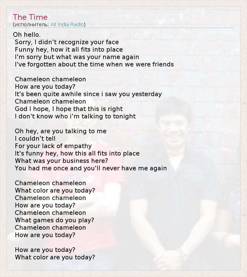 Oh hello. Sorry, I didn't recognize your face Funny hey, how it all fits into place I'm sorry but what was your name again I've forgotten about the time when we were friends Chameleon chameleon How are you today? It's been quite awhile since i saw you yesterday Chameleon chameleon God I hope, I hope that this is right I don't know who i'm talking to tonight Oh hey, are you talking to me I couldn't tell For your lack of empathy It's funny hey, how this all fits into place What was your business here? You had me once and you'll never have me again Chameleon chameleon What color are you today? Chameleon chameleon How are you today? Chameleon chameleon What games do you play? Chameleon chameleon How are you today? How are you today? What color are you today?