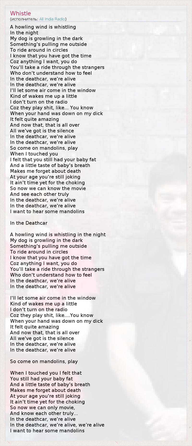 A howling wind is whistling In the night My dog is growling in the dark Something's pulling me outside To ride around in circles I know that you have got the time Coz anything I want, you do You'll take a ride through the strangers Who don't understand how to feel In the deathcar, we're alive In the deathcar, we're alive I'll let some air come in the window Kind of wakes me up a little I don't turn on the radio Coz they play shit, like... You know When your hand was down on my dick It felt quite amazing And now that, that is all over All we've got is the silence In the deathcar, we're alive In the deathcar, we're alive So come on mandolins, play When I touched you I felt that you still had your baby fat And a little taste of baby's breath Makes me forget about death At your age you're still joking It ain't time yet for the choking So now we can know the movie And see each other truly In the deathcar, we're alive In the deathcar, we're alive I want to hear some mandolins In the Deathcar A howling wind is whistling in the night My dog is growling in the dark Something's pulling me outside To ride around in circles I know that you have got the time Coz anything I want, you do You'll take a ride through the strangers Who don't understand how to feel In the deathcar, we're alive In the deathcar, we're alive I'll let some air come in the window Kind of wakes me up a little I don't turn on the radio Coz they play shit, like....You know When your hand was down on my dick It felt quite amazing And now that, that is all over All we've got is the silence In the deathcar, we're alive In the deathcar, we're alive So come on mandolins, play When I touched you I felt that You still had your baby fat And a little taste of baby's breath Makes me forget about death At your age you're still joking It ain't time yet for the choking So now we can only movie, And know each other truly... In the deathcar, we're alive In the deathcar, we're alive, we’re alive I want to hear some mandolins