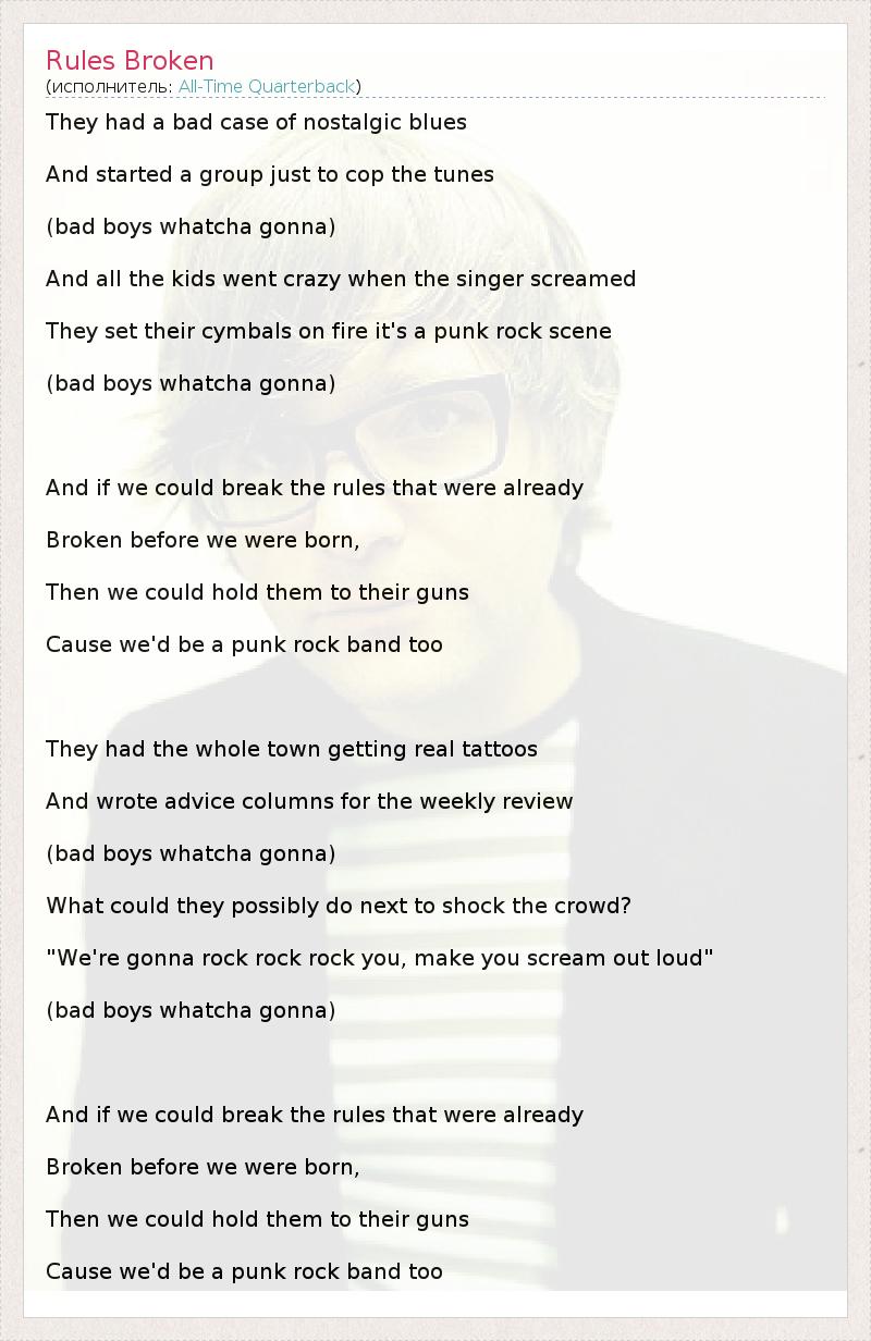 They had a bad case of nostalgic blues And started a group just to cop the tunes (bad boys whatcha gonna) And all the kids went crazy when the singer screamed They set their cymbals on fire it's a punk rock scene (bad boys whatcha gonna) And if we could break the rules that were already Broken before we were born, Then we could hold them to their guns Cause we'd be a punk rock band too They had the whole town getting real tattoos And wrote advice columns for the weekly review (bad boys whatcha gonna) What could they possibly do next to shock the crowd? "We're gonna rock rock rock you, make you scream out loud" (bad boys whatcha gonna) And if we could break the rules that were already Broken before we were born, Then we could hold them to their guns Cause we'd be a punk rock band too