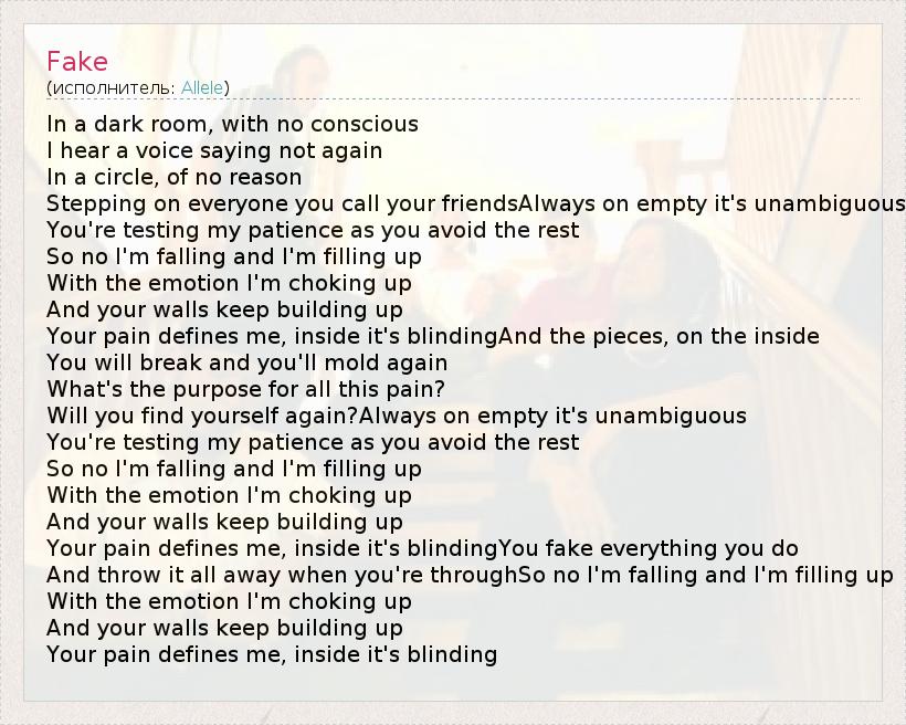 In a dark room, with no conscious I hear a voice saying not again In a circle, of no reason Stepping on everyone you call your friendsAlways on empty it's unambiguous You're testing my patience as you avoid the rest So no I'm falling and I'm filling up With the emotion I'm choking up And your walls keep building up Your pain defines me, inside it's blindingAnd the pieces, on the inside You will break and you'll mold again What's the purpose for all this pain? Will you find yourself again?Always on empty it's unambiguous You're testing my patience as you avoid the rest So no I'm falling and I'm filling up With the emotion I'm choking up And your walls keep building up Your pain defines me, inside it's blindingYou fake everything you do And throw it all away when you're throughSo no I'm falling and I'm filling up With the emotion I'm choking up And your walls keep building up Your pain defines me, inside it's blinding