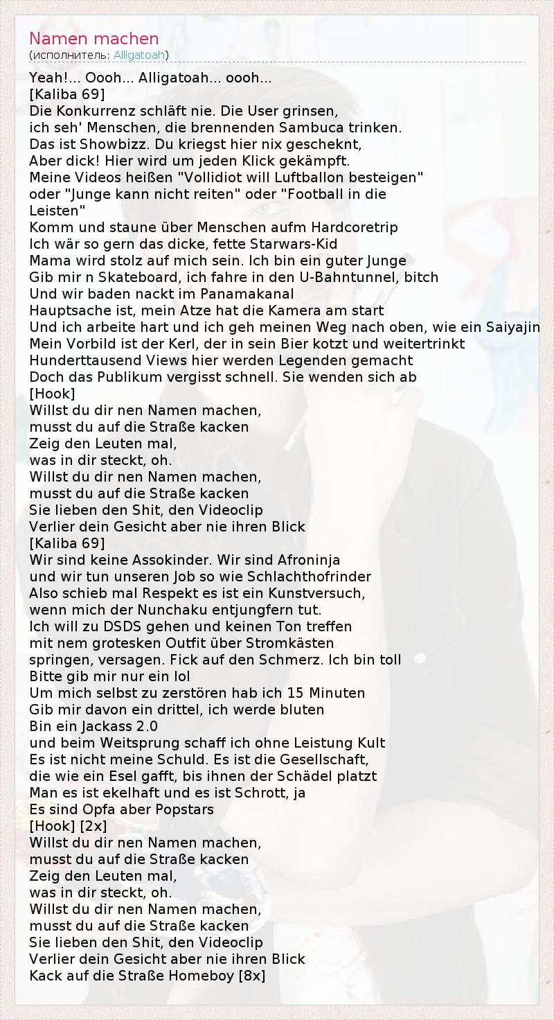 Да! ... Ооо ... Alligatoah ... ооо ... [ Kaliba 69] Die Konkurrenz schläft NIE . Die grinsen пользователя , ич SEH " Menschen , умирают brennenden Sambuca Trinken . Дас ист Showbizz . Du kriegst HIER Никс gescheknt , Aber член ! Хир WIRD мкм Jeden Klick gekämpft . Meine Видео Хайссен " Vollidiot будет Luftballon besteigen " Одер " Юнге канн Nicht Рейтен " Одер " Футбол в умирают Leisten " Комм унд staune über Menschen aufm Hardcoretrip Ich войны так Gern дас Дике , Fette Звездные войны -Kid Мама вирда Штольц Ауф Mich Сейн . Ich бен Эйн Guter Юнге Гиб мир н Скейтборд , ич Fahre в ден U- Bahntunnel , сукин Und Wir Баден Nackt им Panamakanal Hauptsache ист , майн Atze шляпа умирают Kamera утра начать Und ич arbeite олень унд ич GEH Meinen Weg нач Обен , Wie Эйн Saiyajin Mein Vorbild ист дер Керл , дер в Sein Bier kotzt унд weitertrinkt Hunderttausend Просмотров иерархи Werden Legenden gemacht Дочь дас Publikum vergisst Schnell . Sie Венден Сич аб [Припев ] Willst дю реж нен Namen Machen , musst дю Ауф умереть Straße kacken Zeig ден Leuten мал , был в реж steckt , о. Willst дю реж нен Namen Machen , musst дю Ауф умереть Straße kacken Sie Lieben ден Черт, ден Видеоклип Verlier Dein Gesicht Aber ние Ihren Blick [ Kaliba 69] Wir Синд Keine Assokinder . Wir Синд Afroninja унд Wir тун unseren работы так Wie Schlachthofrinder Также schieb мал Респект эс ист Эйн Kunstversuch , Wenn Mich дер нунчаку entjungfern тут . Ich будет Zu DSDS Gehen Und Keinen Ton Treffen мит NEM grotesken Экипировка über Stromkästen Springen , versagen . Фик Ауф ден Schmerz . Ich бен платной Bitte клин мир нур Эйн лол Гм Mich Селбст цу zerstören хаб ич 15 Minuten Гиб мир Davon Эйн drittel , ич Werde Blüten Бен Эйн Чудаки 2.0 унд Beim Weitsprung Шафф ич Ohne Leistung Культ Es ист Nicht Meine Schuld . Es ист умереть Gesellschaft , умереть Wie Эйн Esel gafft , бис Ihnen дер Schädel platzt Человек эс ист Ekelhaft унд эс ист Шротт , JA Es Синд Opfa Aber Стань звездой [Припев ] [ 2x ] Willst дю реж нен Namen Machen , musst дю Ауф умереть Straße kacken Zeig ден Leuten мал , был в реж steckt , о. Willst дю реж нен Namen Machen , musst дю Ауф умереть Straße kacken Sie Lieben ден Черт, ден Видеоклип Verlier Dein Gesicht Aber ние Ihren Blick Kack Ауф умереть Straße Homeboy [ 8x ]