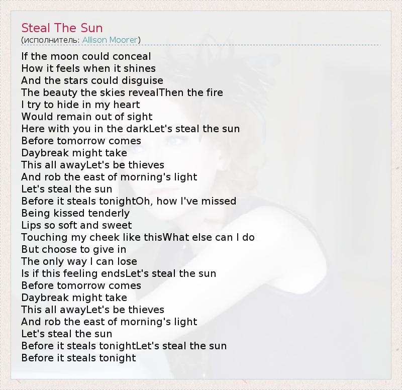 If the moon could conceal How it feels when it shines And the stars could disguise The beauty the skies revealThen the fire I try to hide in my heart Would remain out of sight Here with you in the darkLet's steal the sun Before tomorrow comes Daybreak might take This all awayLet's be thieves And rob the east of morning's light Let's steal the sun Before it steals tonightOh, how I've missed Being kissed tenderly Lips so soft and sweet Touching my cheek like thisWhat else can I do But choose to give in The only way I can lose Is if this feeling endsLet's steal the sun Before tomorrow comes Daybreak might take This all awayLet's be thieves And rob the east of morning's light Let's steal the sun Before it steals tonightLet's steal the sun Before it steals tonight