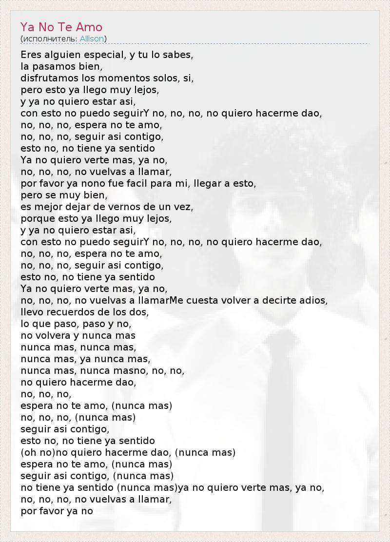 Eres alguien especial, y tu lo sabes, la pasamos bien, disfrutamos los momentos solos, si, pero esto ya llego muy lejos, y ya no quiero estar asi, con esto no puedo seguirY no, no, no, no quiero hacerme dao, no, no, no, espera no te amo, no, no, no, seguir asi contigo, esto no, no tiene ya sentido Ya no quiero verte mas, ya no, no, no, no, no vuelvas a llamar, por favor ya nono fue facil para mi, llegar a esto, pero se muy bien, es mejor dejar de vernos de un vez, porque esto ya llego muy lejos, y ya no quiero estar asi, con esto no puedo seguirY no, no, no, no quiero hacerme dao, no, no, no, espera no te amo, no, no, no, seguir asi contigo, esto no, no tiene ya sentido Ya no quiero verte mas, ya no, no, no, no, no vuelvas a llamarMe cuesta volver a decirte adios, llevo recuerdos de los dos, lo que paso, paso y no, no volvera y nunca mas nunca mas, nunca mas, nunca mas, ya nunca mas, nunca mas, nunca masno, no, no, no quiero hacerme dao, no, no, no, espera no te amo, (nunca mas) no, no, no, (nunca mas) seguir asi contigo, esto no, no tiene ya sentido (oh no)no quiero hacerme dao, (nunca mas) espera no te amo, (nunca mas) seguir asi contigo, (nunca mas) no tiene ya sentido (nunca mas)ya no quiero verte mas, ya no, no, no, no, no vuelvas a llamar, por favor ya no
