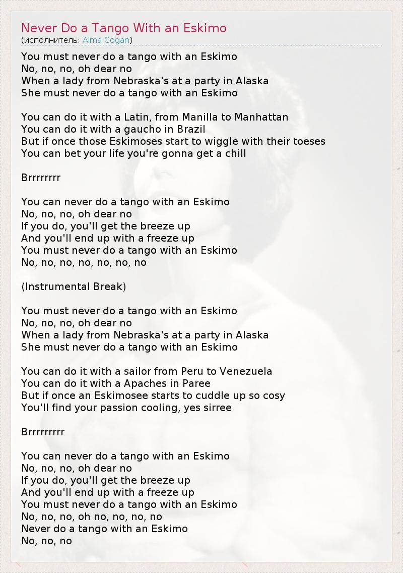 А как ты думаешь, о чем песня "Never Do a Tango With an Eskimo" ?