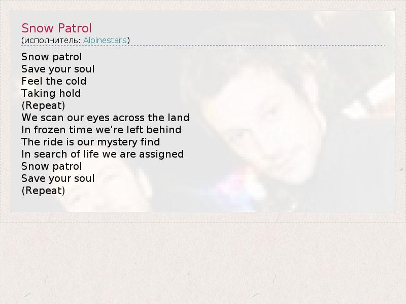 Snow patrol Save your soul Feel the cold Taking hold (Repeat) We scan our eyes across the land In frozen time we're left behind The ride is our mystery find In search of life we are assigned Snow patrol Save your soul (Repeat)